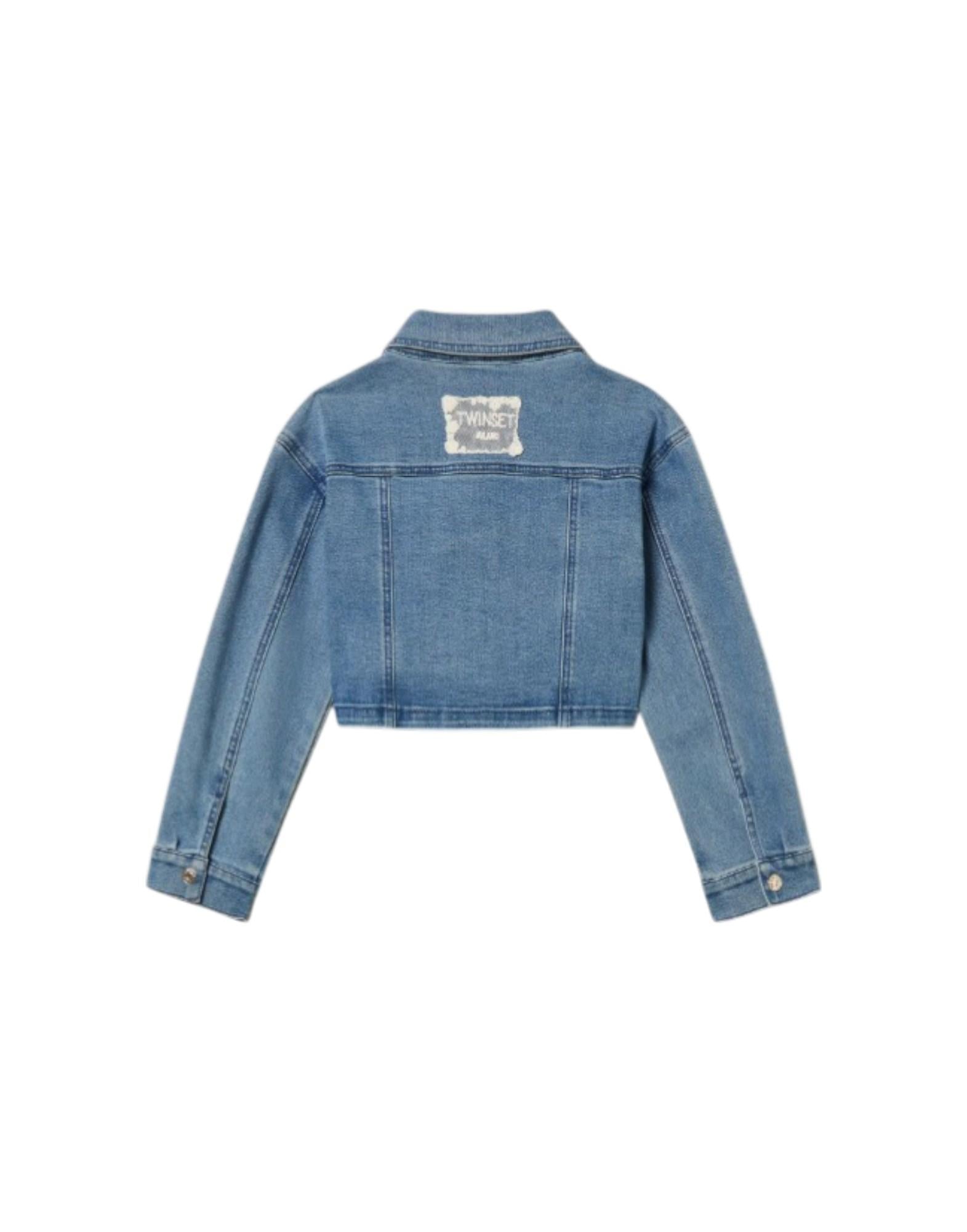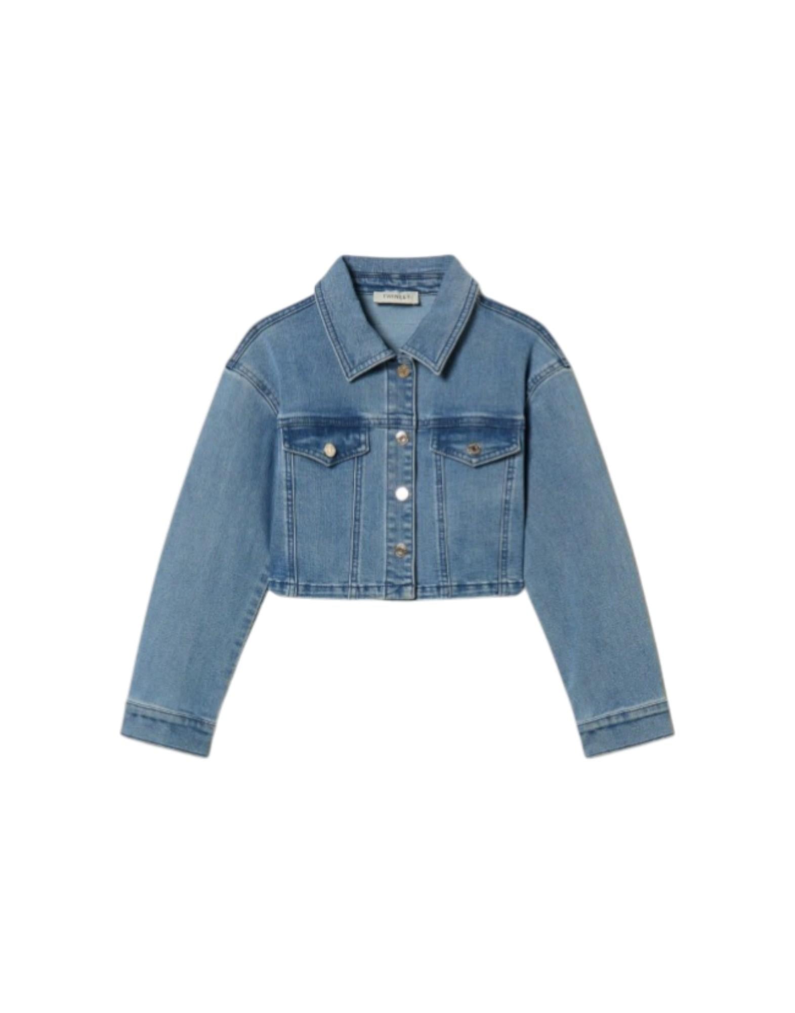 Giacca cropped da bambina realizzata in denim stretch con lavaggio medio, caratterizzata da una linea dritta che unisce stile contemporaneo e comfort. Il modello presenta colletto a camicia e chiusura frontale con bottoni a pressione logati.