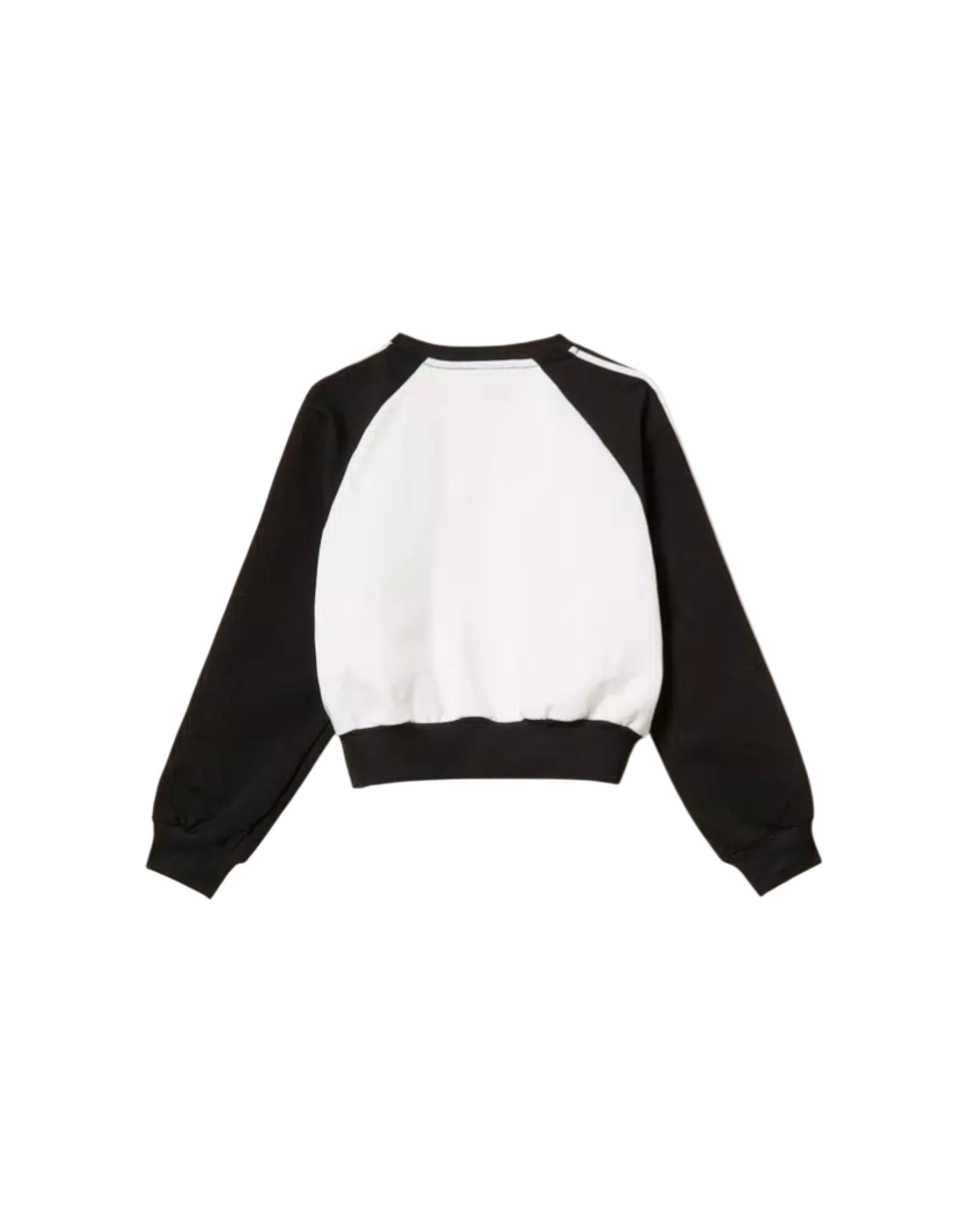 Felpa da bambina realizzata in cotone stretch con design color block, caratterizzata da una linea morbida che garantisce comfort e libertà di movimento. Il modello presenta collo tondo e maniche lunghe impreziosite da passamaneria a righe, dettaglio grafico che aggiunge dinamismo al capo.