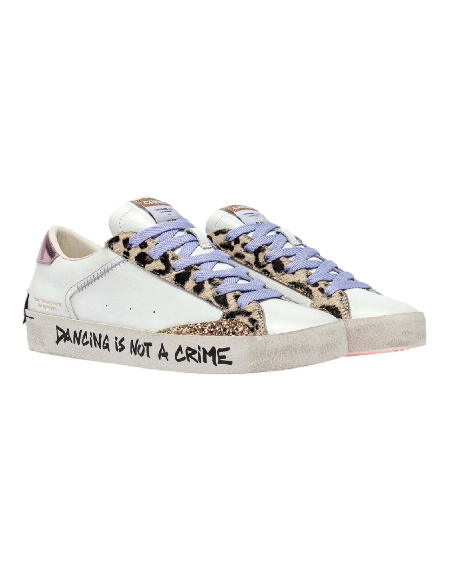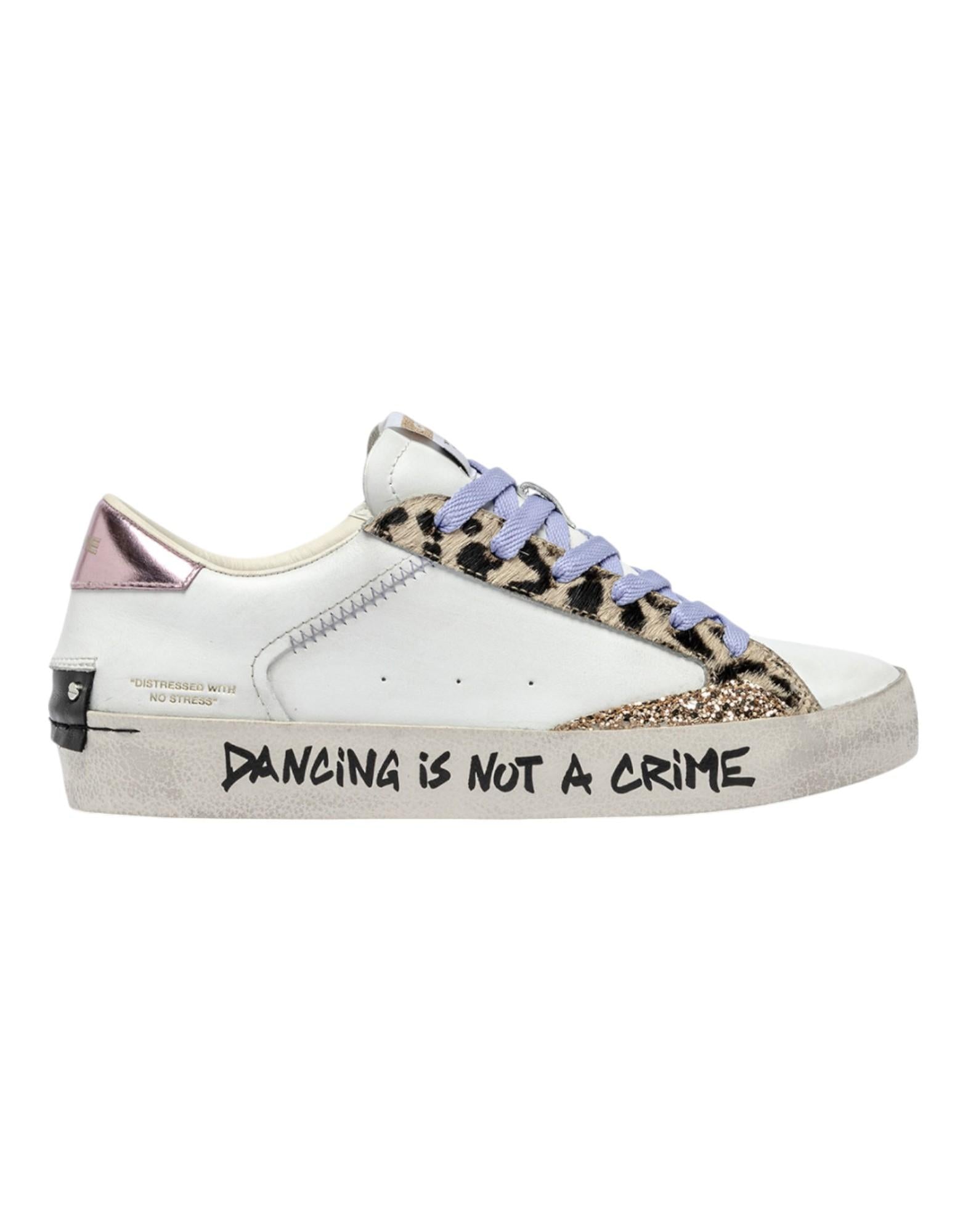 La sneaker Crime London Distressed 20006PP7 esprime lo stile urban-chic del brand con una combinazione di materiali e dettagli di carattere. La tomaia in pelle bianca premium è arricchita da inserti glitter rosa e oro e da un talloncino in cavallino leopardato, per un look moderno e distintivo. La suola in ecopelle fasciata ivory (2,5 - 3 cm) assicura comfort e leggerezza, mentre la fodera in pelle e tessuto garantisce traspirabilità. Sul retro spicca la scritta "DISTRESSED WITH NO STRESS", firma originale che completa il design.