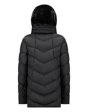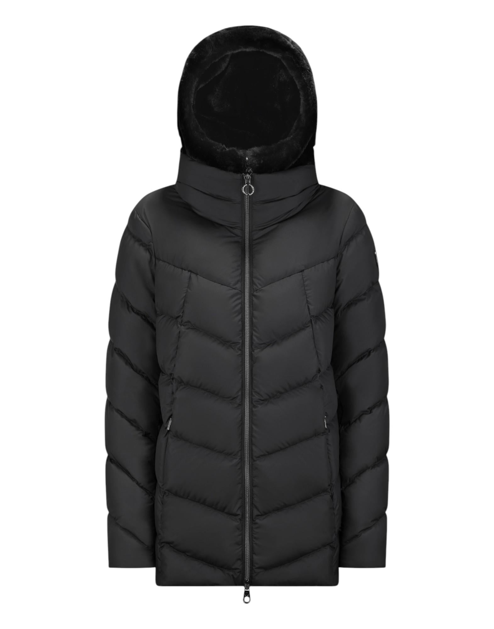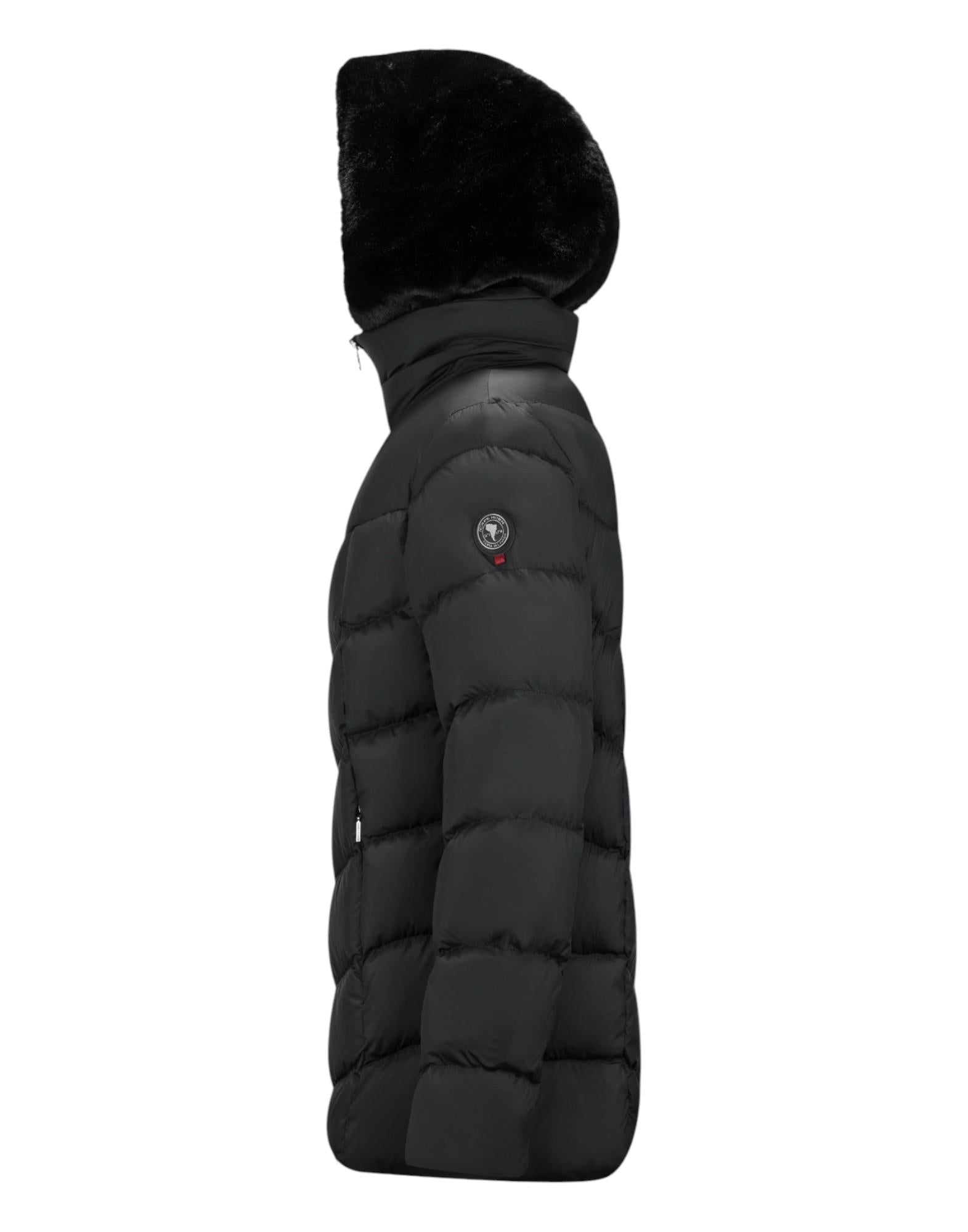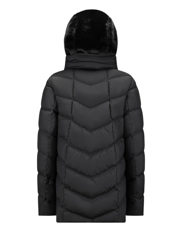 Piumino trapuntato dal design elegante a campana, con vestibilità regolare sulle spalle e silhouette morbida. Imbottito in piuma naturale certificata JIS 90% fiocco con filling power 800 cuin, assicura calore fino a -10°C mantenendo leggerezza e comfort. Il cappuccio e la pettorina in ecopelliccia removibili permettono di personalizzare lo stile, mentre le zip invisibili laterali migliorano la libertà di movimento. La zip centrale a spirale con doppio cursore e puller personalizzati, insieme alle due tasche interne portadocumenti, aggiungono praticità e dettagli distintivi.