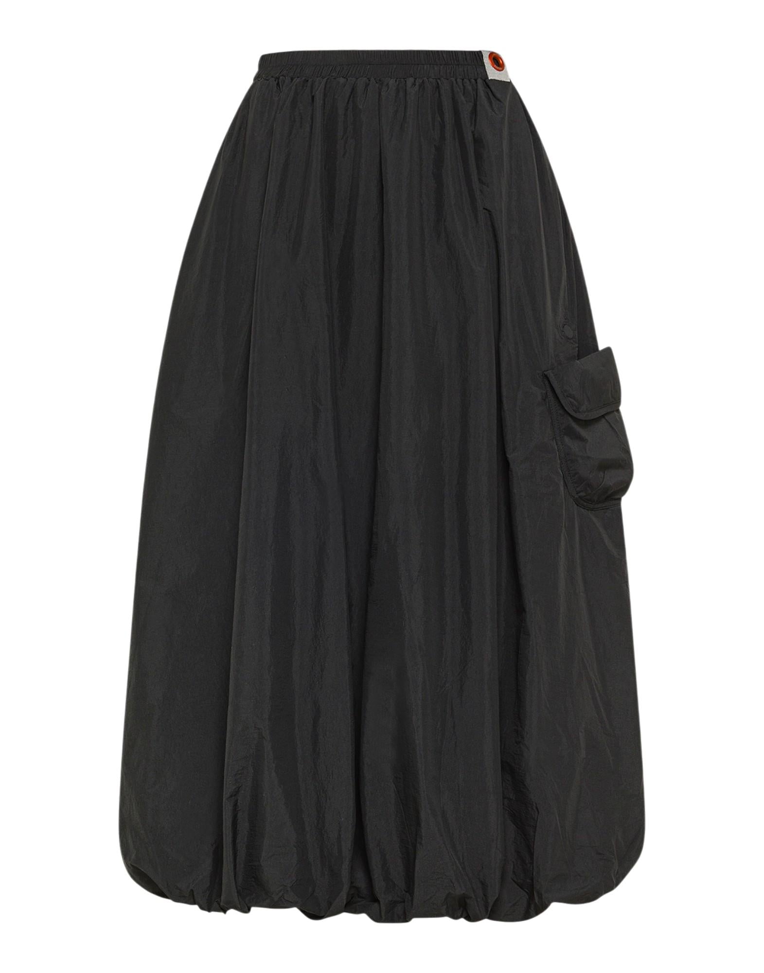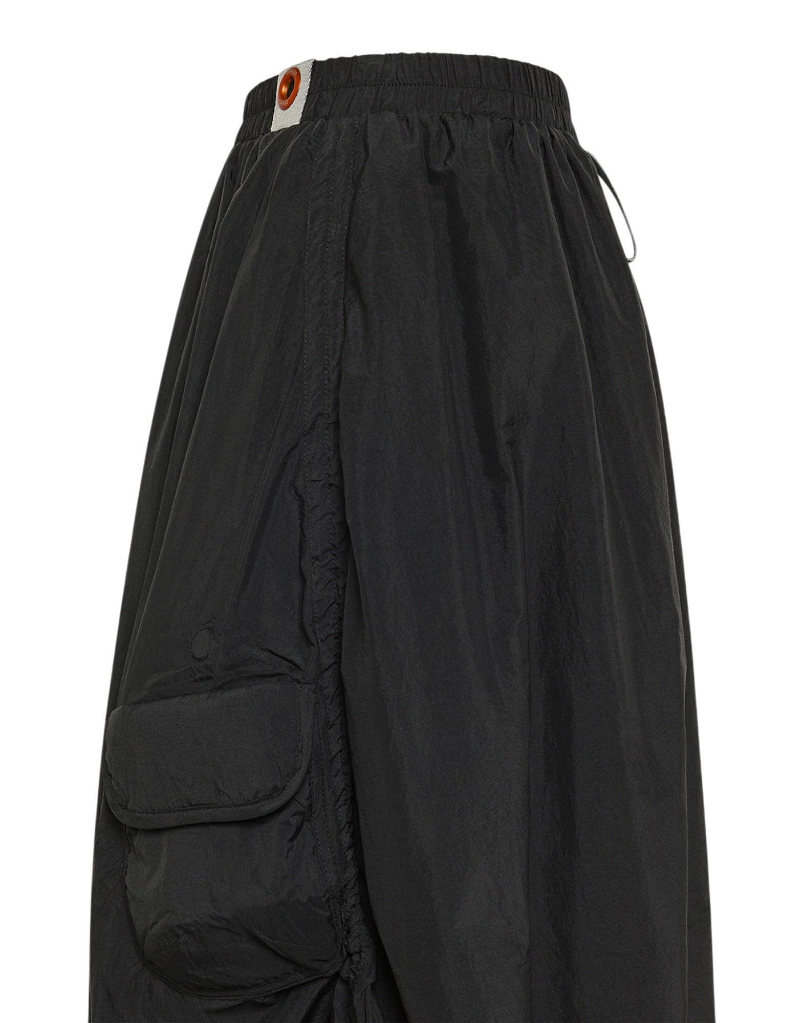Maxigonna dal carattere tecnico e contemporaneo, realizzata in nylon superleggero 20 denari con finitura semi-opaca. Il tessuto combina estrema leggerezza e resistenza, mentre il trattamento water repellent offre protezione da umidità e pioggia leggera. La silhouette ampia e leggermente svasata può essere modulata grazie alla coulisse regolabile sul fondo, che trasforma la linea in una forma a palloncino più compatta e dinamica. Il design è completato da un taschino laterale con patta e chiusura magnetica, patch applicata e cavallotto in vita con oblò metallico, elemento iconico Dekker. Un capo versatile e trasformabile che coniuga performance, funzionalità e stile urbano.