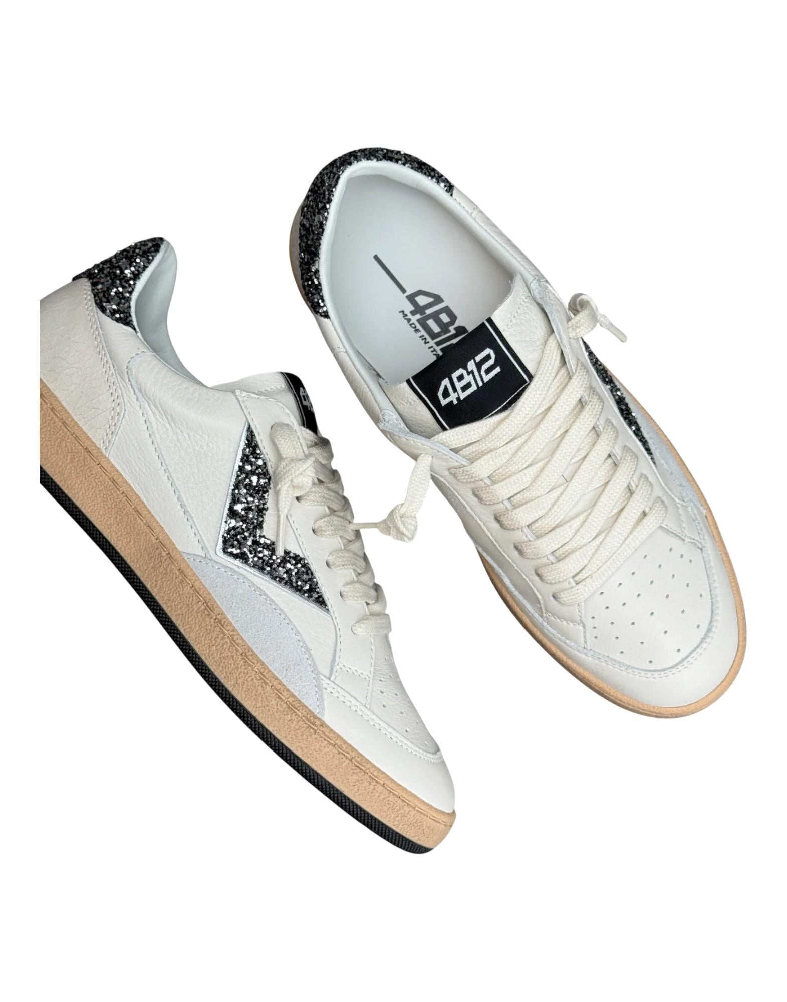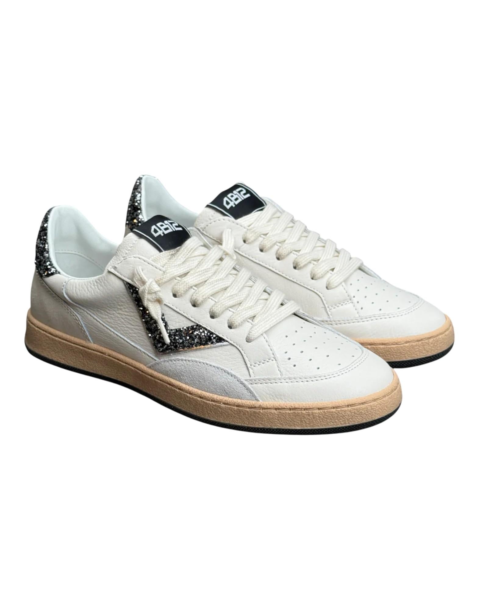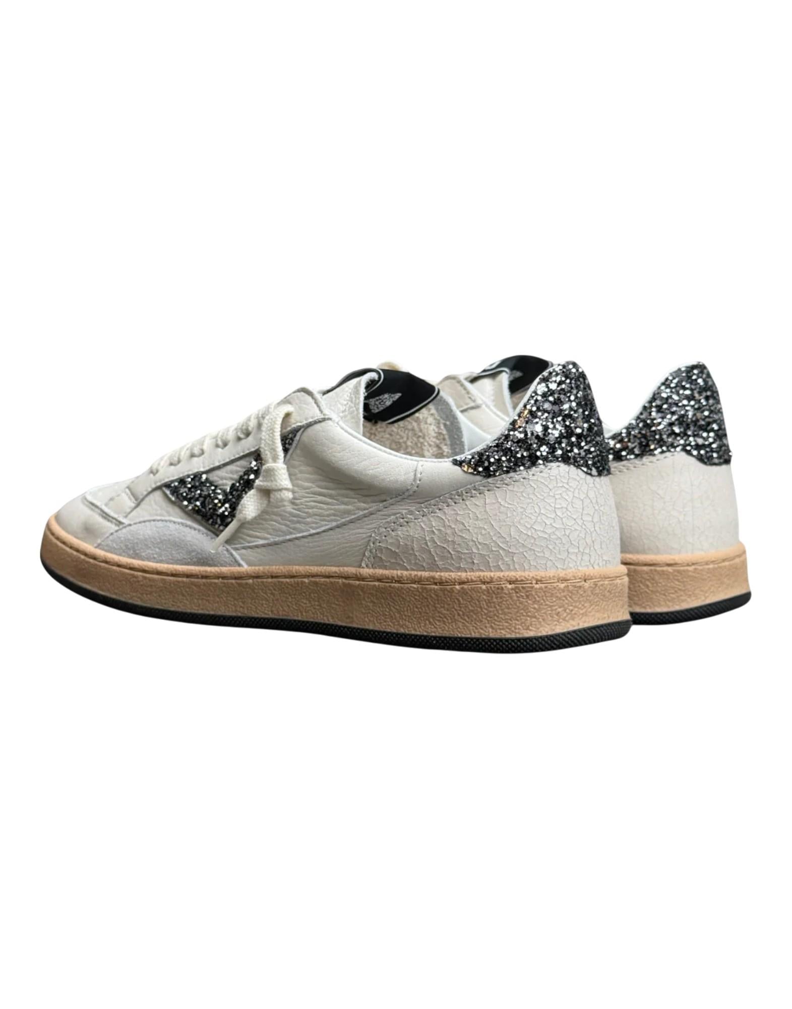 Realizzata in pelle bianca con dettagli in camoscio perla, presenta un talloncino e logo laterale in glitter antracite che donano un tocco luminoso e femminile.