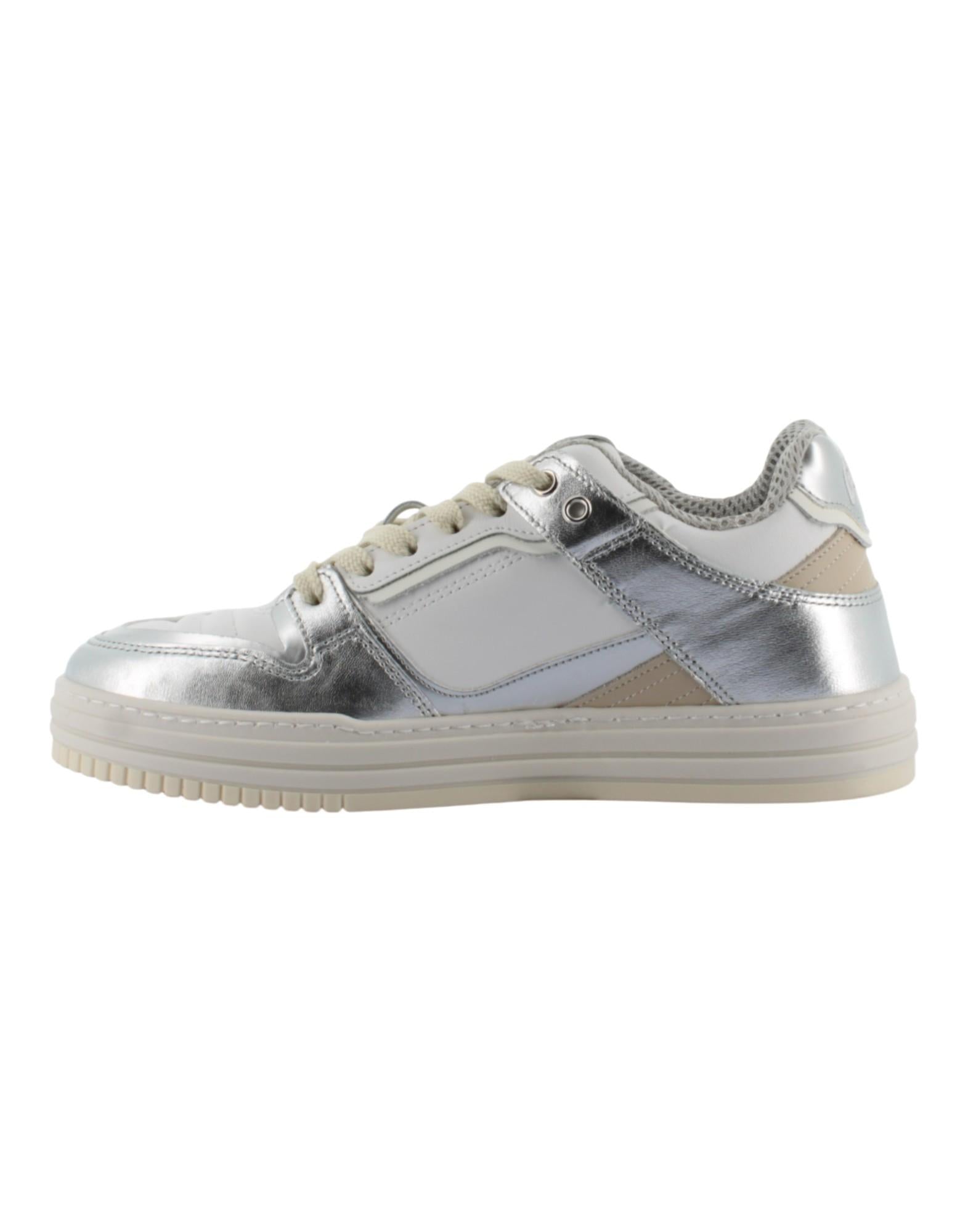 - Tomaia in pelle bianca con dettagli argento metallizzato