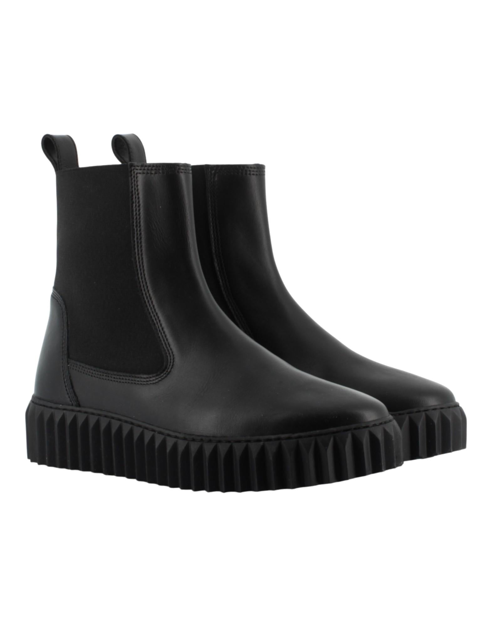 Lo stivaletto Voile Blanche Beth combina un'estetica minimal con dettagli moderni e una costruzione di alta qualità. Realizzato in pelle di vitello nera, presenta linee essenziali e una suola in gomma a rilievo che dona carattere e stabilità.