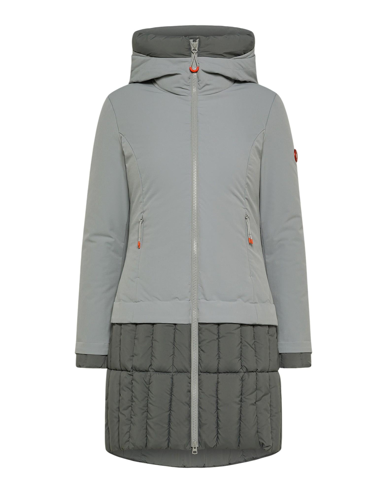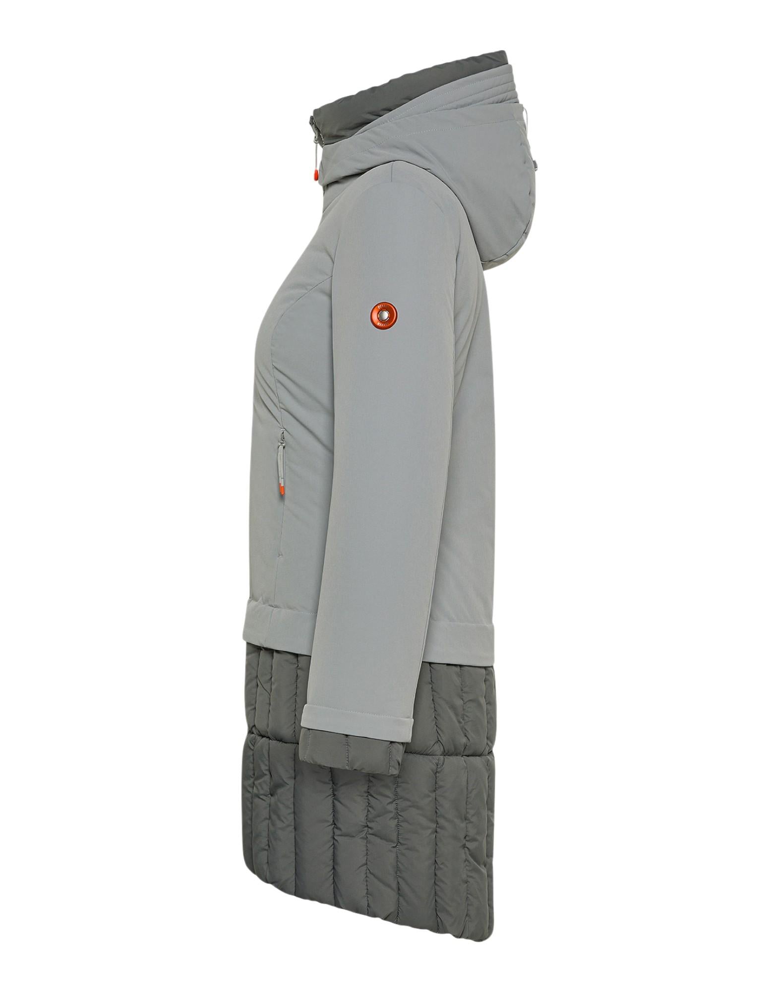 Realizzato con una combinazione di materiali performanti, unisce la parte superiore in scuba tecnico di nylon elasticizzato, dalla texture morbida e opaca con finitura water repellent, alla parte inferiore in nylon superleggero 20 denari trapuntato a lingotti e imbottito con materiale sintetico Sorona®, che assicura calore senza appesantire.