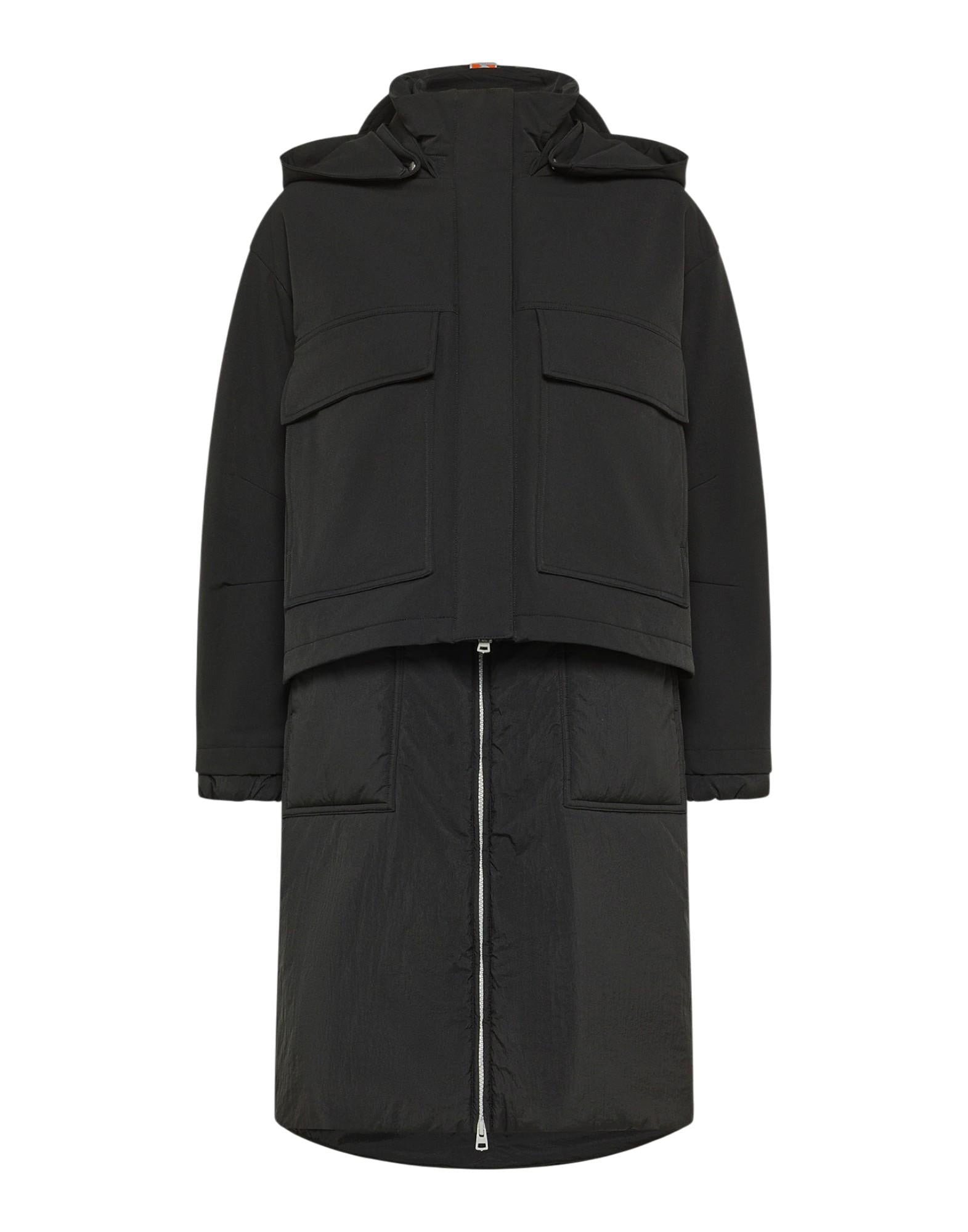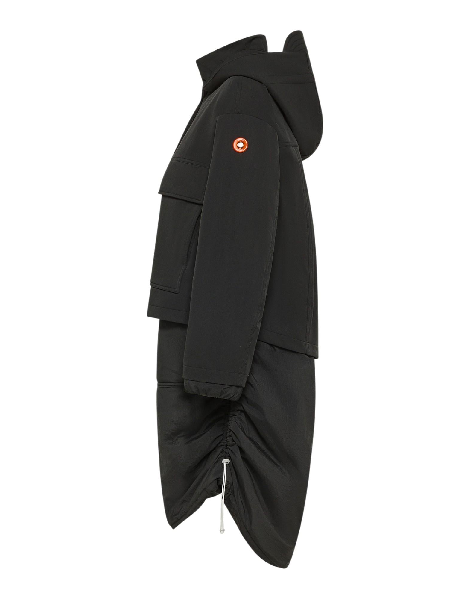 Parka oversize dal design ibrido e deciso, realizzato in doppio tessuto per un perfetto equilibrio tra estetica e funzionalità. La parte superiore, in scuba tecnico di nylon elasticizzato, presenta una texture opaca e morbida al tatto, con superficie leggermente mossa e trattamento water repellent che richiama le forme compatte dei windbreaker militari. La parte inferiore, invece, è in nylon superleggero 20 denari, con finitura semi-opaca e mano impalpabile: scende come una gonna tecnica creando un raffinato effetto layer dinamico e funzionale. Le quattro ampie tasche frontali, il cappuccio staccabile e il collo in piedi assicurano protezione e comfort in ogni condizione. L'imbottitura sintetica in Sorona garantisce calore e leggerezza. Dettagli iconici come la personalizzazione metallica a forma di oblò sul braccio sinistro e il nastro arancione con logo applicato verticalmente sul cappuccio confermano il codice visivo distintivo Dekker. Un capo dallo stile contemporaneo, che unisce performance tecnica e ricerca stilistica.