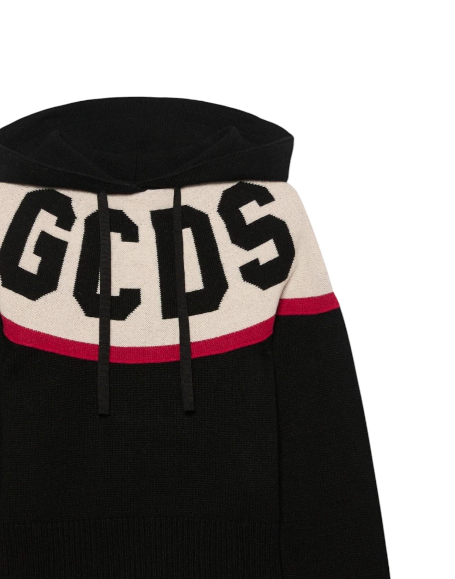 La vestibilità cropped e le spalle scese donano un tocco moderno e rilassato, mentre il maxi logo GCDS a intarsio e la riga a contrasto sul petto sottolineano l'identità grafica del brand. Il cappuccio con coulisse regolabile e le finiture a costine su fondo e polsini completano il design con un equilibrio perfetto tra comfort e stile.