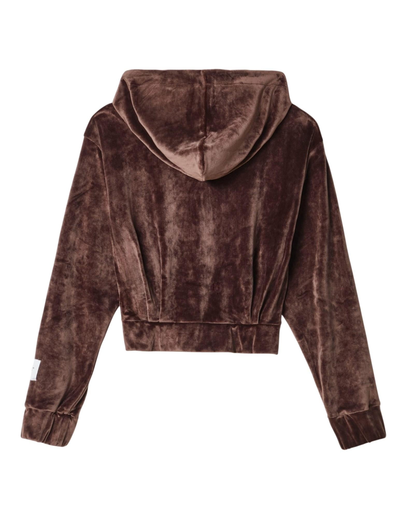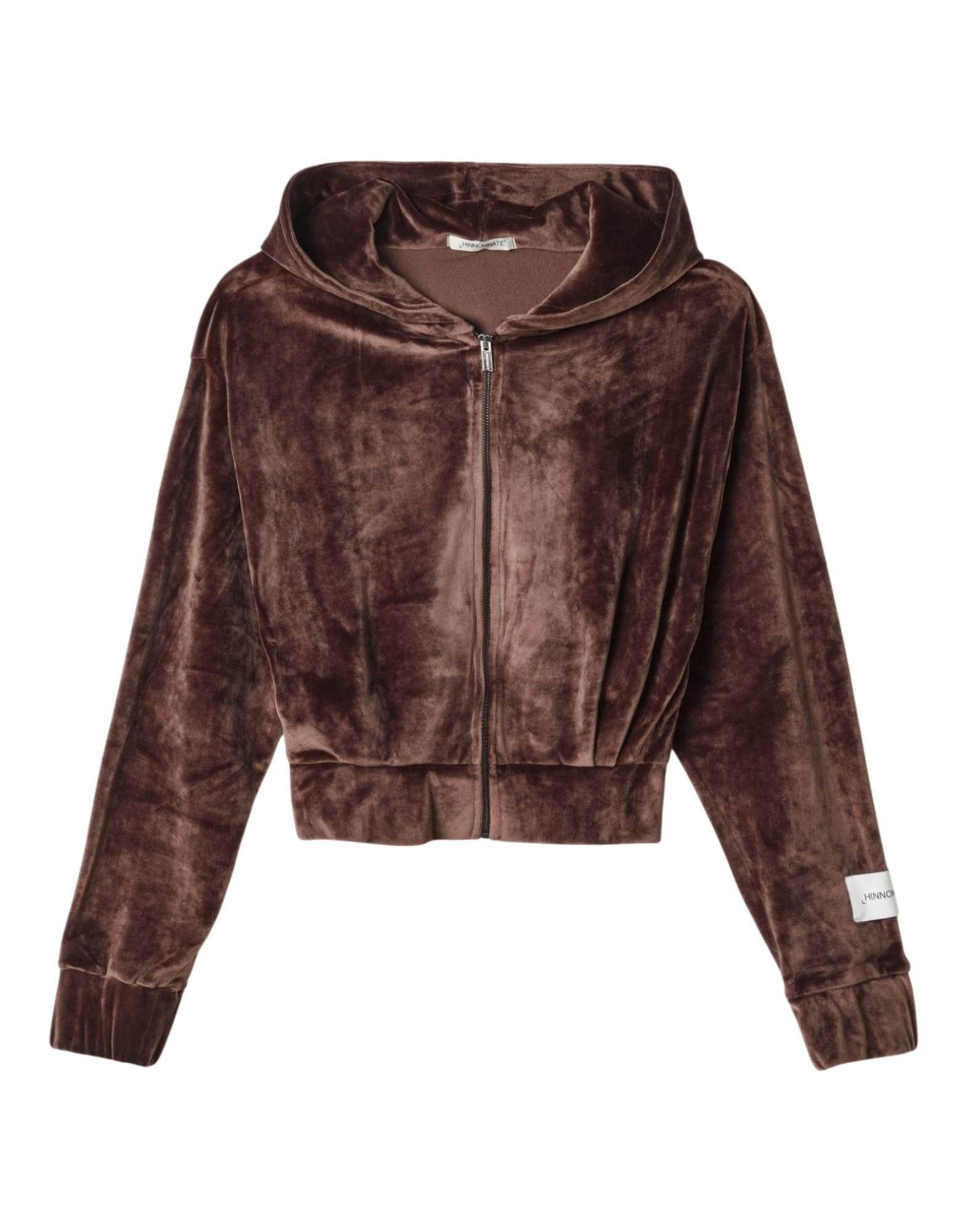 La giacca con cappuccio in ciniglia di Hinnominate combina morbidezza e femminilità in un capo dal design raffinato. Realizzata in ciniglia stretch dall'effetto luminoso e avvolgente, presenta pences alla balza che donano struttura e una silhouette leggermente svasata. Il cappuccio e la chiusura frontale completano un look casual-chic, perfetto per il tempo libero o per outfit coordinati con i pantaloni in ciniglia della collezione.