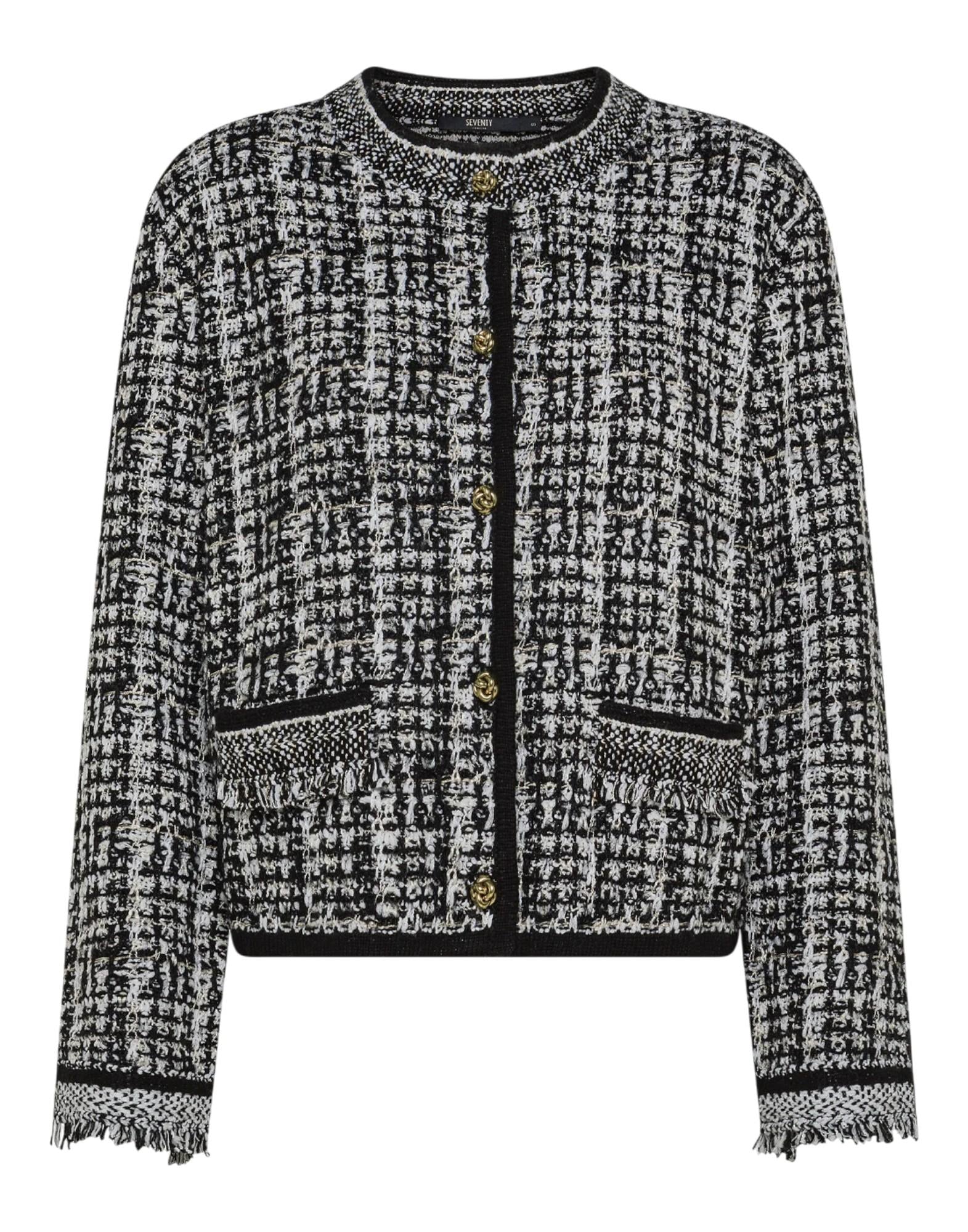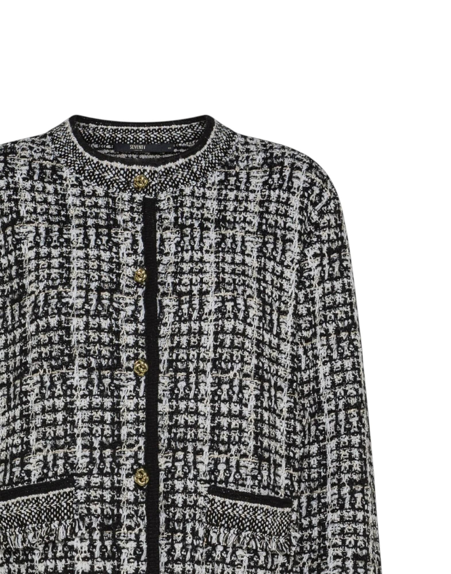 La maglia coreana Seventy esprime eleganza e femminilità con un design curato nei dettagli. Realizzata in punto fantasia dalla texture compatta e raffinata, presenta bottoni gioiello dorati sul davanti, finte tasche con frange e spacchi sui polsi, per un effetto sofisticato e contemporaneo. Perfetta da indossare come cardigan leggero o come capo protagonista di look eleganti e disinvolti.