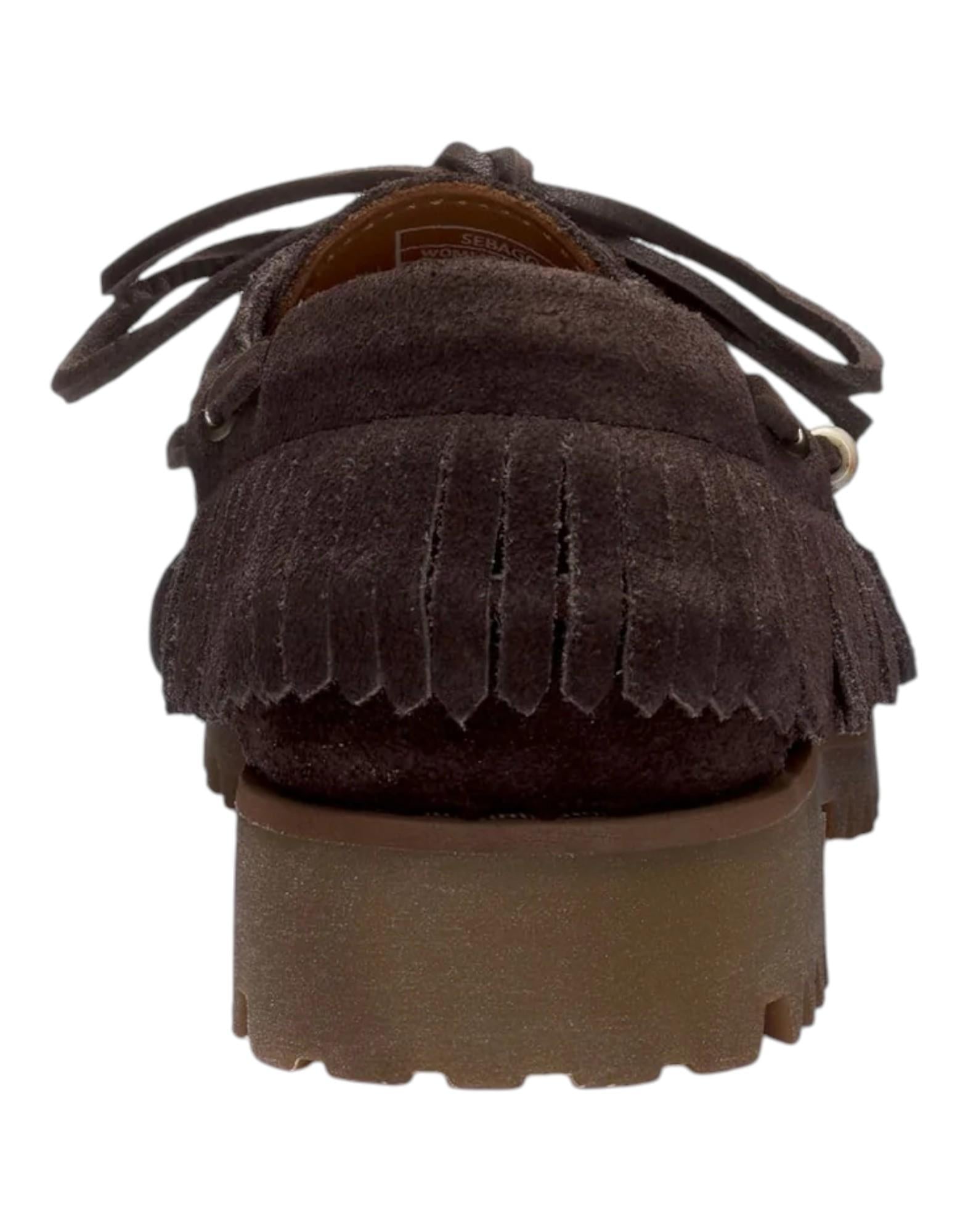 Ispirato alla tradizione outdoor del brand, questo mocassino donna combina artigianalità e robustezza. Realizzato a mano in morbida pelle scamosciata, è impreziosito da dettagli decorativi come le perline sui lati e la frangia sul tallone. La suola alta in gomma carrarmato garantisce stabilità, resistenza e aderenza ottimale, rendendo questo modello perfetto per affrontare la stagione autunno/inverno con stile e comfort.
