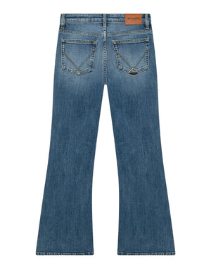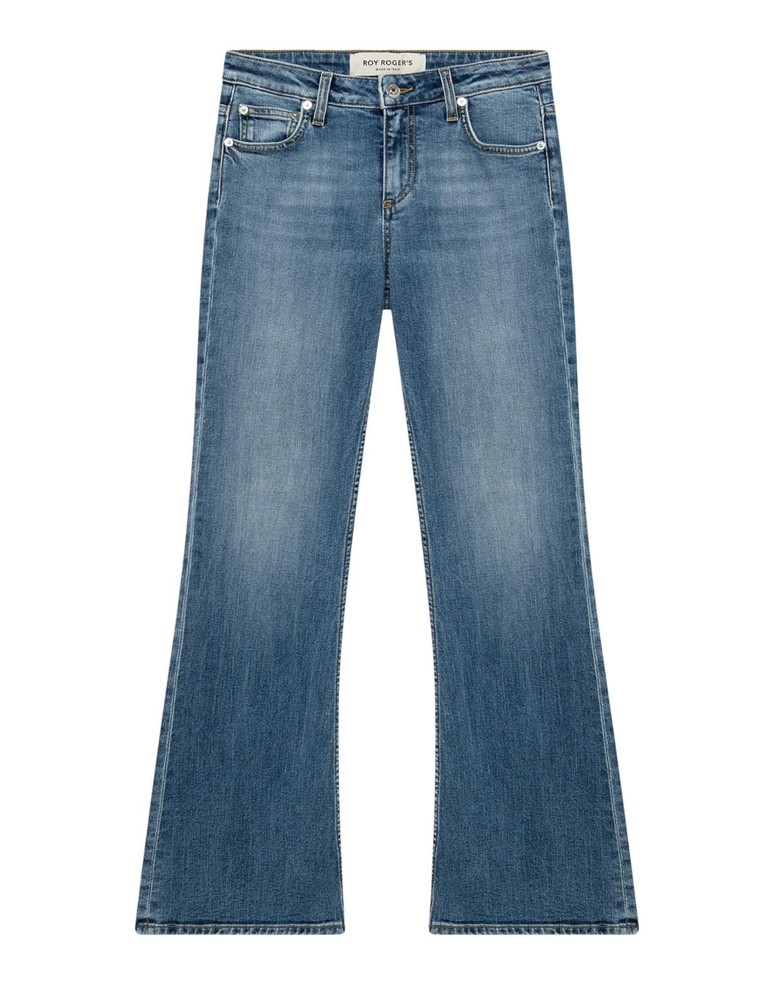 Jeans firmati Roy Roger's realizzati in denim stretch con lavaggio medio e leggere baffature sul fronte per un effetto naturalmente vissuto. Il modello New Roy presenta vita media con passanti, chiusura con bottone logato e zip, e label Roy Roger's applicata sul retro. Le due tasche sul fronte e le due sul retro con label del brand completano il design con i dettagli iconici della tradizione denim italiana. Il taglio bootcut offre una vestibilità equilibrata e moderna, perfetta per un look casual e raffinato.