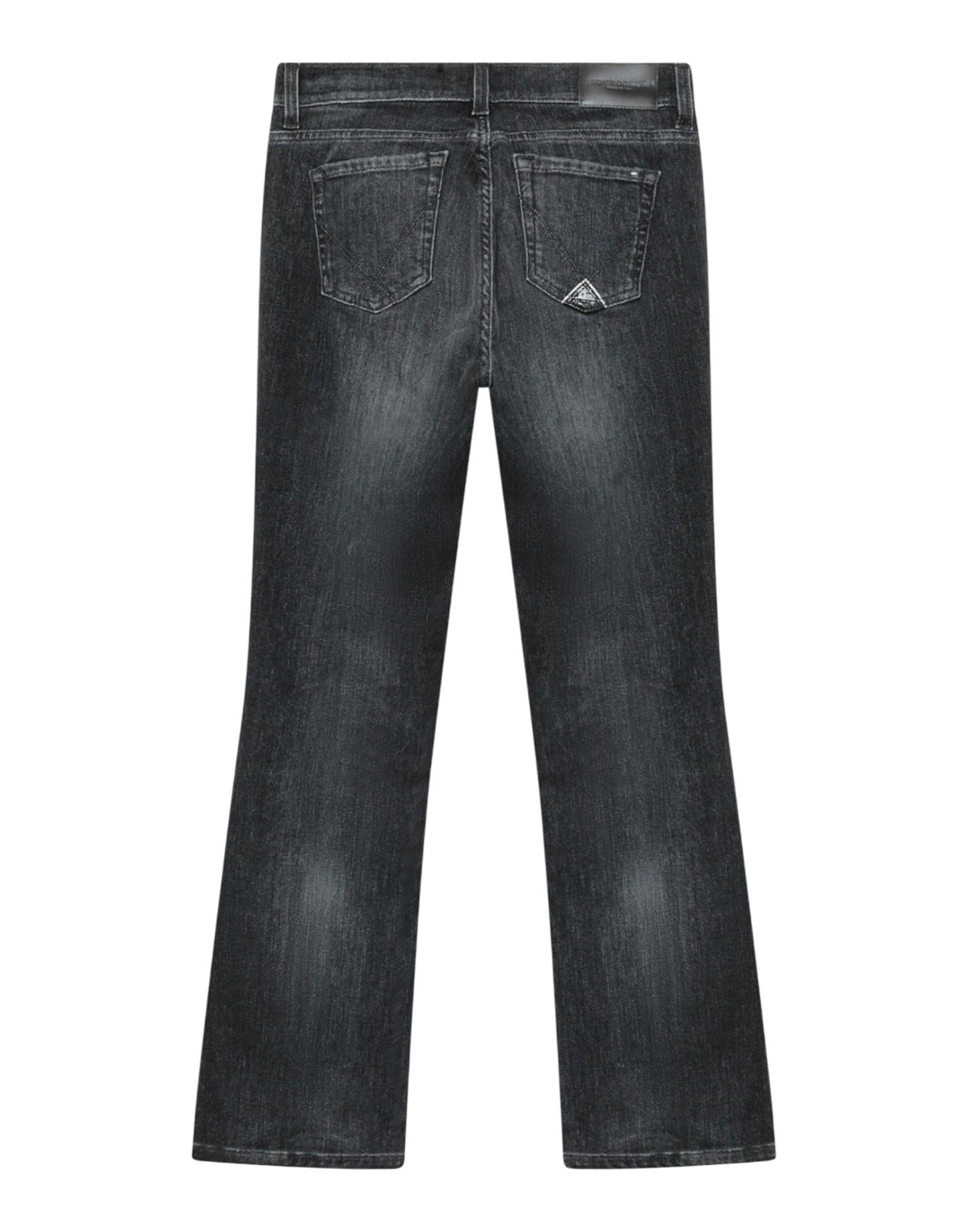 Jeans donna firmati Roy Roger's realizzati in denim stretch tinta unita, caratterizzati da un lavaggio uniforme e una vestibilità moderna. Il modello Zandra presenta vita media con passanti, chiusura con bottone logato e zip, e un taglio bootcut che slancia la figura con eleganza. Le due tasche sul fronte e le due tasche sul retro con label Roy Roger's applicata completano il design con i dettagli iconici del brand. Un capo versatile e femminile, perfetto per look quotidiani dal gusto raffinato.