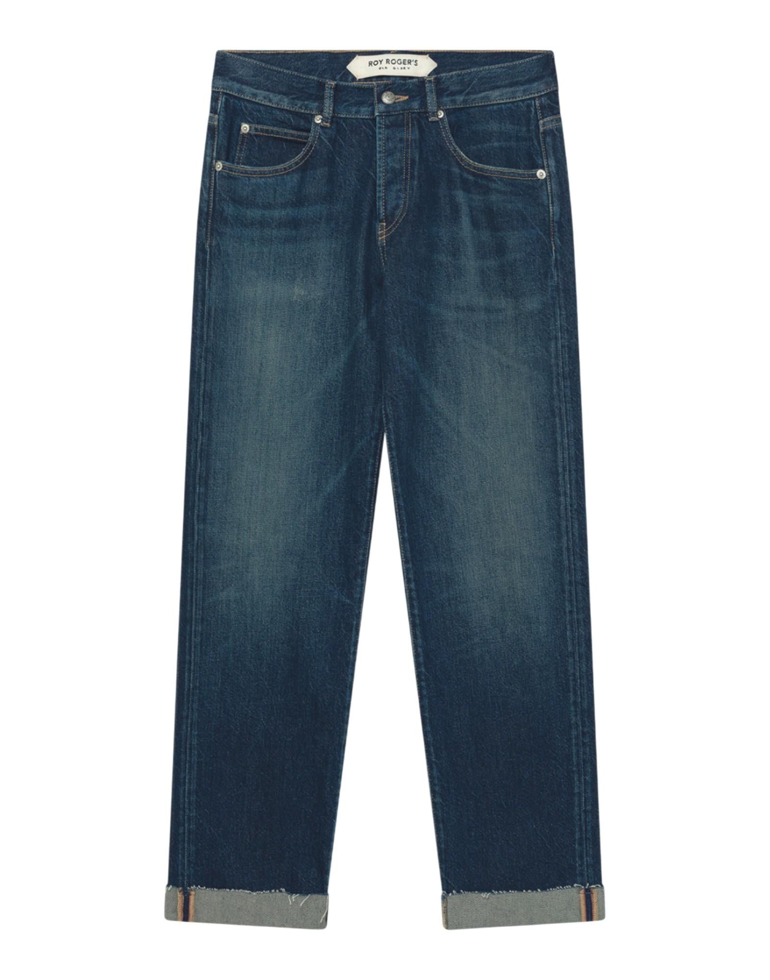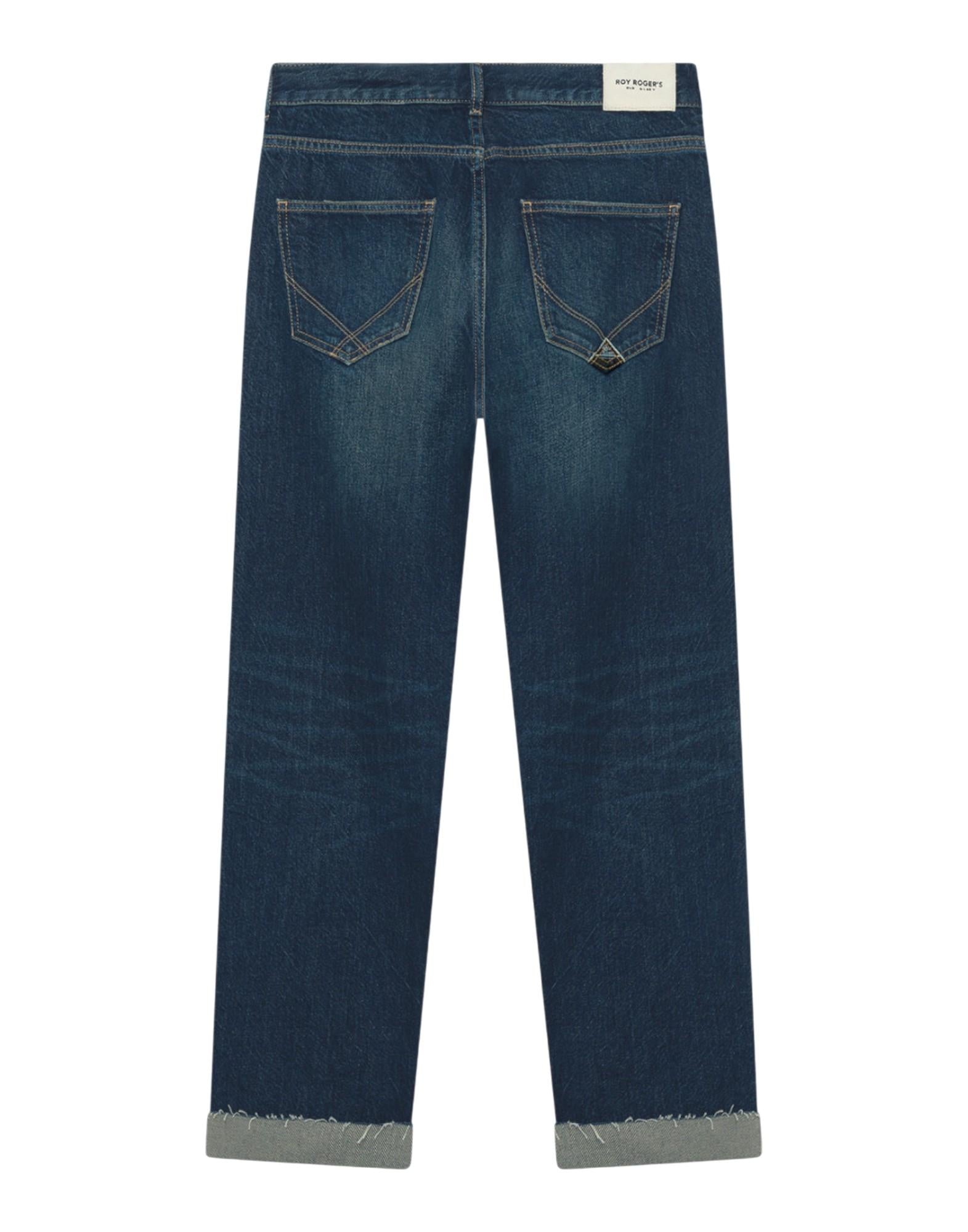 Jeans donna firmati Roy Roger's della linea Old Glory, realizzati in denim con lavaggio scuro e leggero effetto used con strappi. Il modello New Oskar Kyra presenta vita media con passanti, chiusura con bottoni logati e label Roy Roger's applicata sul retro. Le due tasche sul fronte e le due sul retro con label del brand completano il design con dettagli autentici e artigianali. Il fondo a taglio vivo con micro reverse aggiunge un tocco grintoso, mentre il taglio boyfriend garantisce comfort e un look rilassato dallo stile urbano.