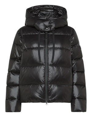 Piumino corto con volume moderno e trapunte ampie, realizzato in nylon lucido trattato per un effetto setoso e morbido. L'imbottitura in piuma naturale certificata con fill power 650 garantisce calore e leggerezza. Il doppio cappuccio - uno interno fisso e uno esterno removibile - assicura versatilità e protezione. Dettagli distintivi come il collo alto con bottoni a pressione, la zip centrale a doppio cursore a vista in contrasto nero e le ampie tasche laterali definiscono un design pratico e urbano. Il tessuto è completato da una finitura idrorepellente. Vestibilità regular.