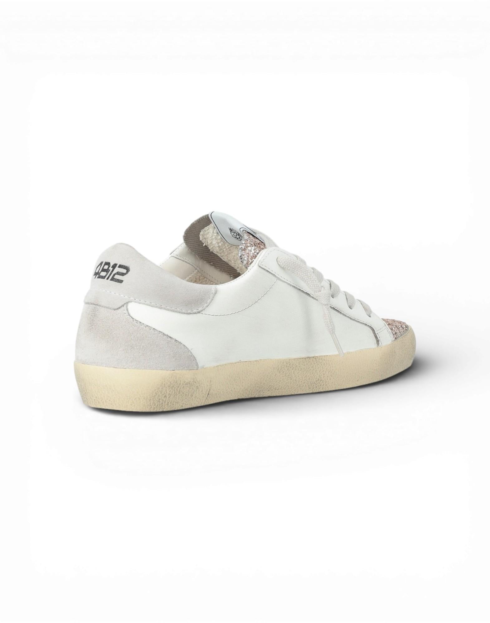 Sneakers dal design contemporaneo che uniscono materiali classici e dettagli luminosi. La tomaia in pelle è arricchita da elementi in glitter sulla linguetta e sul logo laterale, creando un contrasto distintivo e ricercato. Il talloncino in suede completa la costruzione con una nota materica elegante.