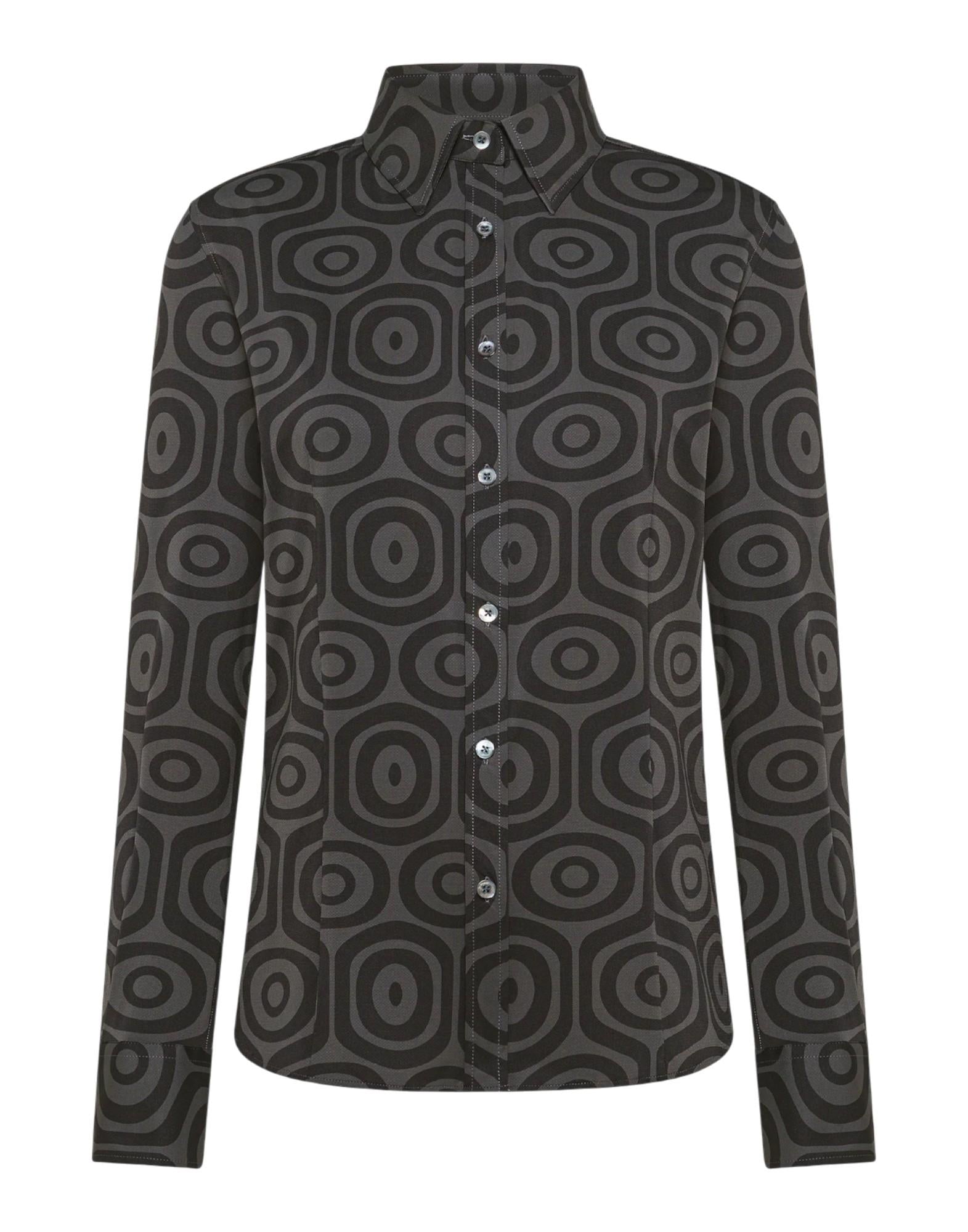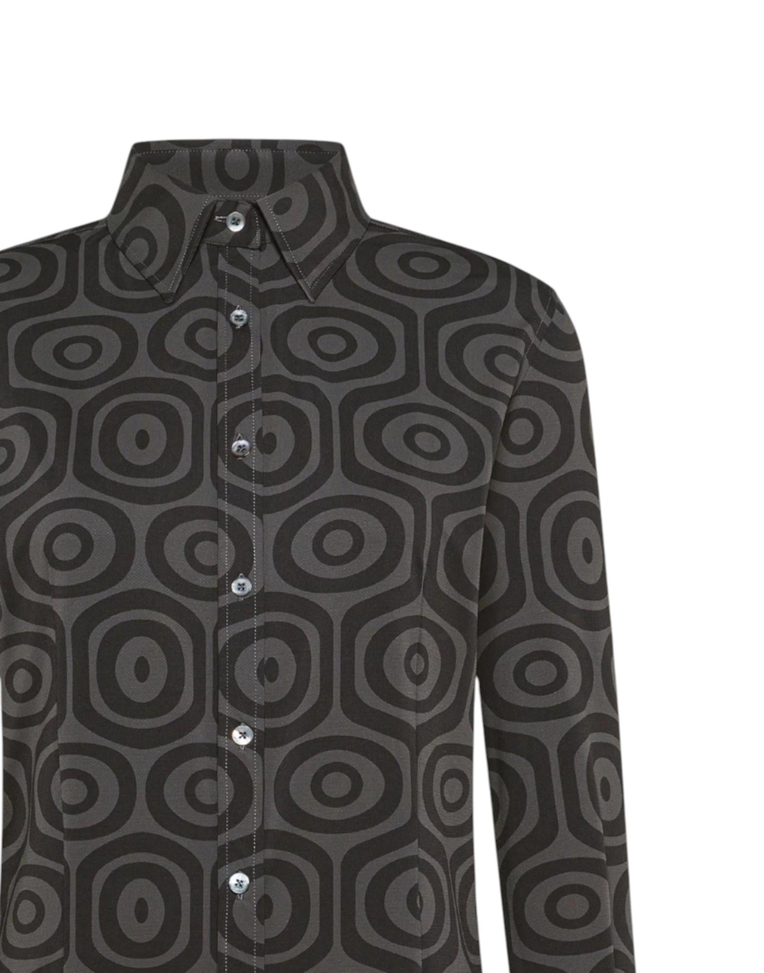 Camicia dal carattere deciso e raffinato, realizzata in pregiato tessuto Oxford elasticizzato, morbido e traspirante. Si distingue per la stampa optical allover, ispirata all'estetica grafica degli anni '60 e reinterpretata in chiave contemporanea per uno stile audace e sofisticato.