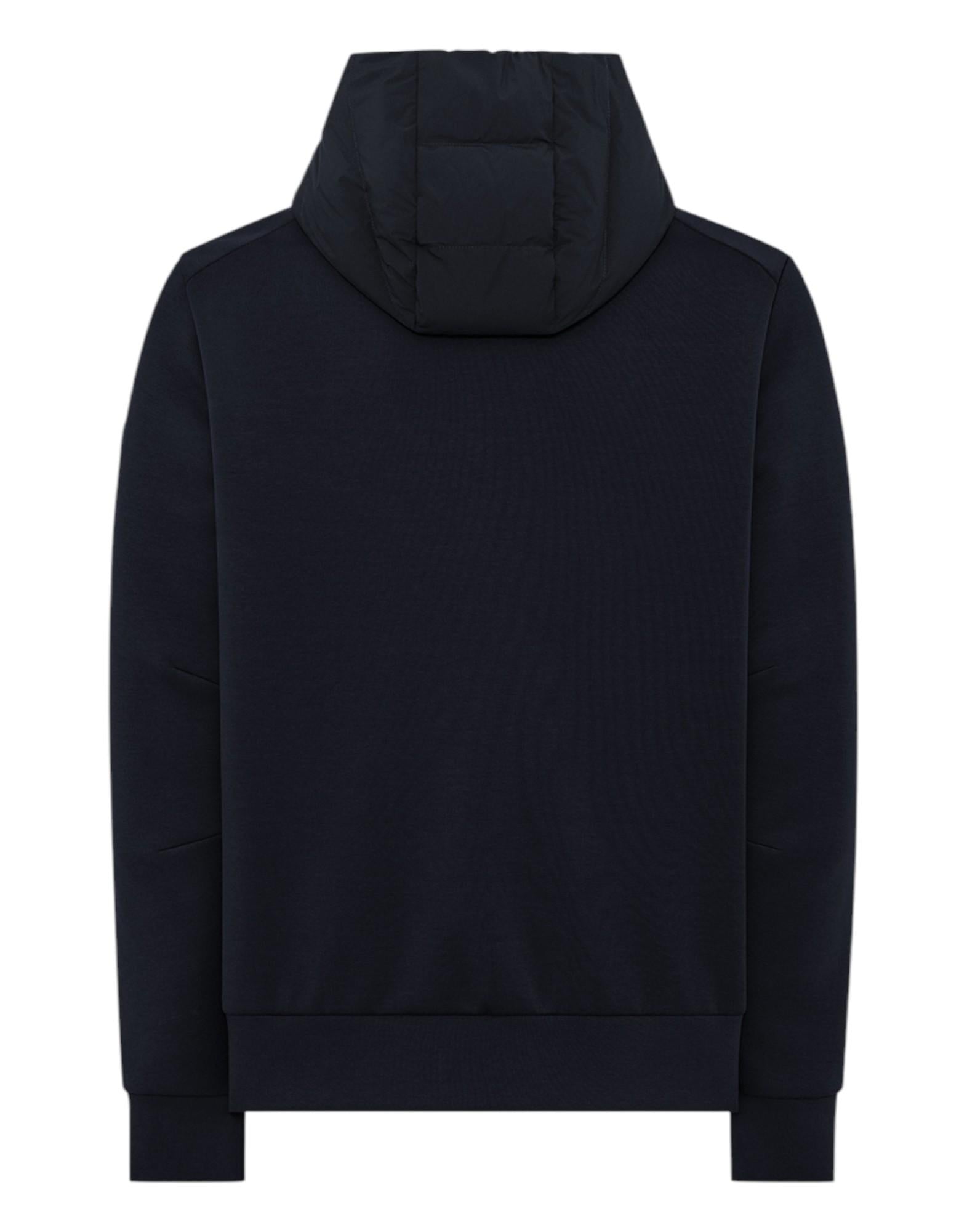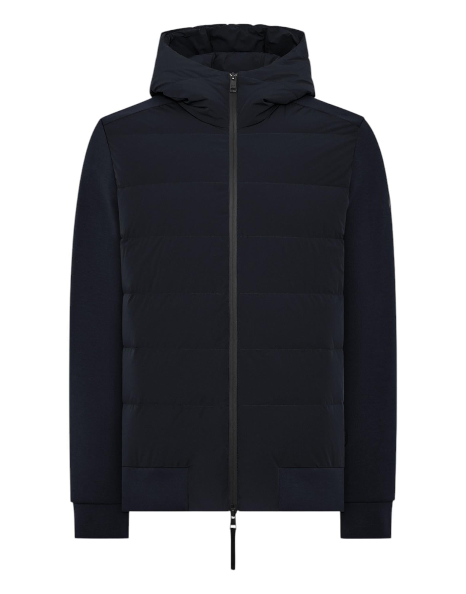 Giubbino imbottito dal design sportivo e contemporaneo, caratterizzato da pannelli frontali trapuntati e maniche in tessuto tecnico elasticizzato che garantiscono comfort e libertà di movimento. Il cappuccio fisso e la zip a doppio cursore completano un capo versatile e funzionale, ideale per la stagione fredda.
