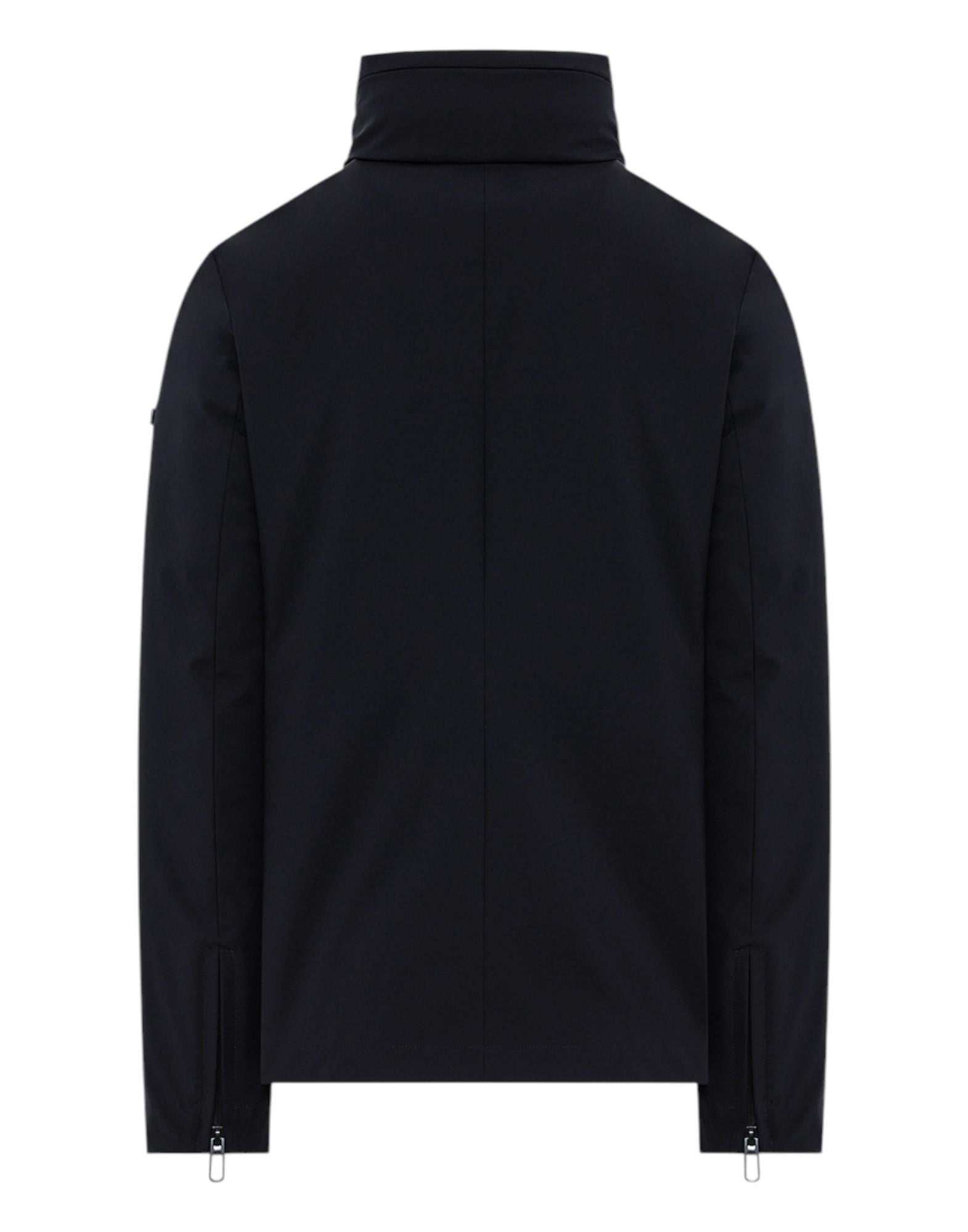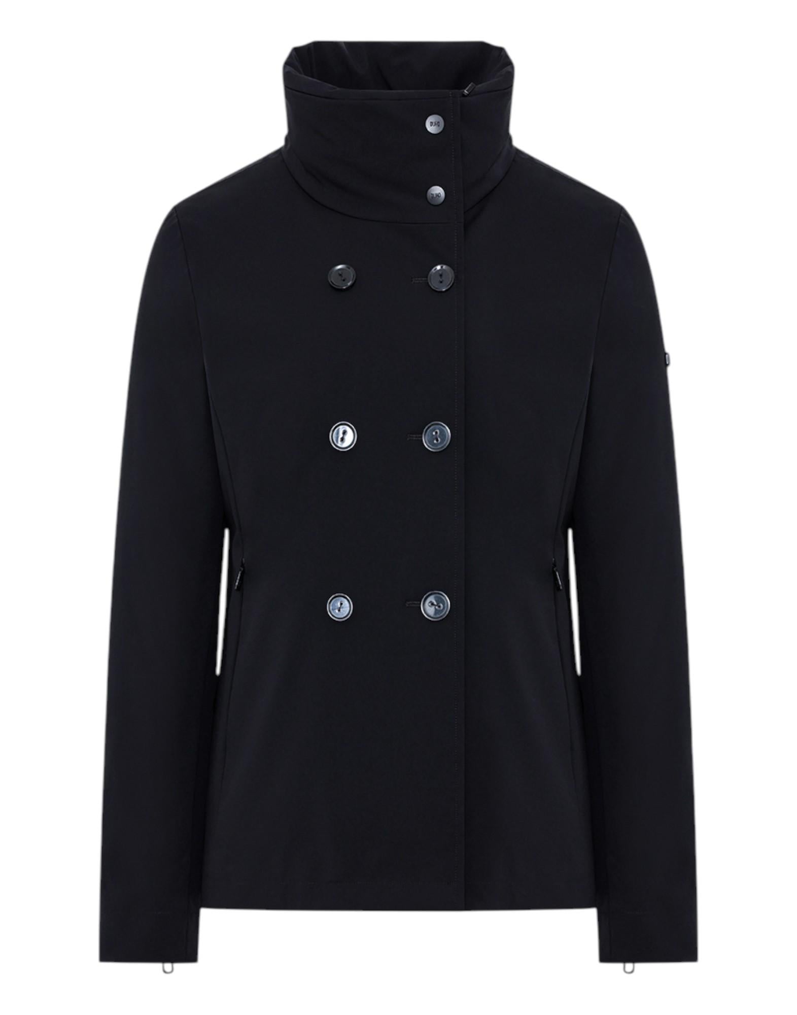 Giubbino doppiopetto dal design elegante e contemporaneo, realizzato in tessuto tecnico elasticizzato che garantisce comfort e libertà di movimento. Il collo alto strutturato, la chiusura con bottoni e zip nascosta, insieme ai dettagli minimal, rendono questo capo versatile e perfetto per la stagione fredda.