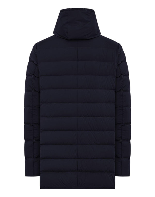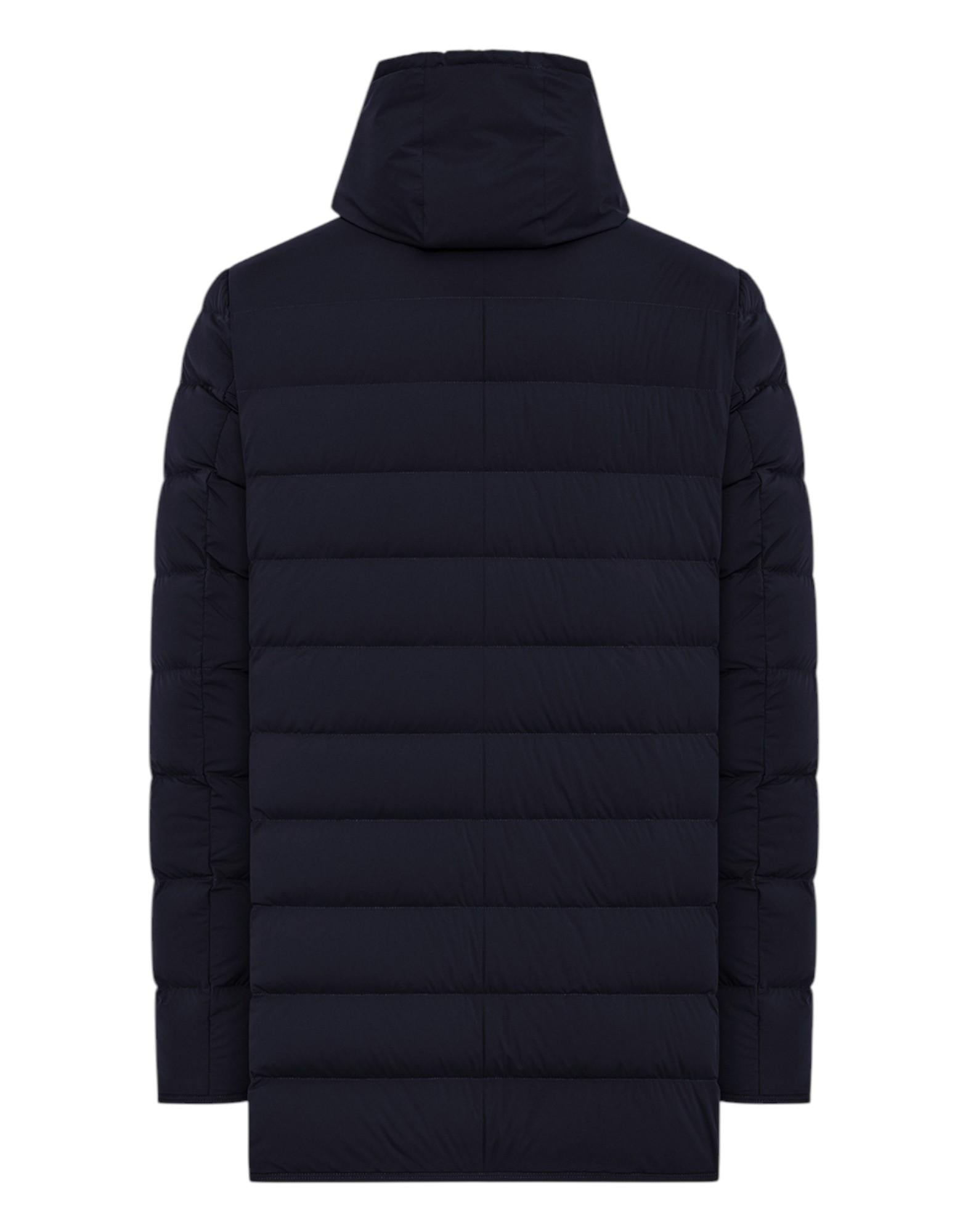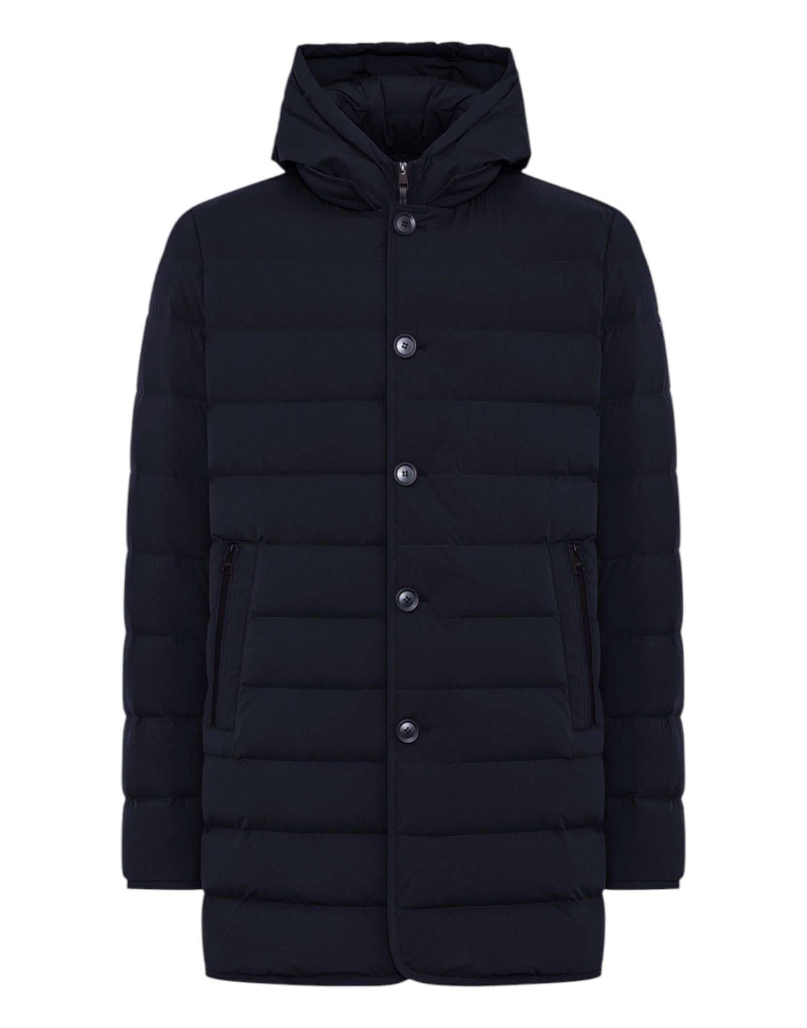Giaccone lungo imbottito dal design pulito e moderno, ideale per affrontare l'inverno con comfort e funzionalità. Realizzato in tessuto tecnico elasticizzato, garantisce protezione e libertà di movimento. La trapuntatura orizzontale conferisce al capo uno stile contemporaneo, mentre il cappuccio fisso e la chiusura con bottoni e zip lo rendono pratico e versatile.