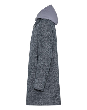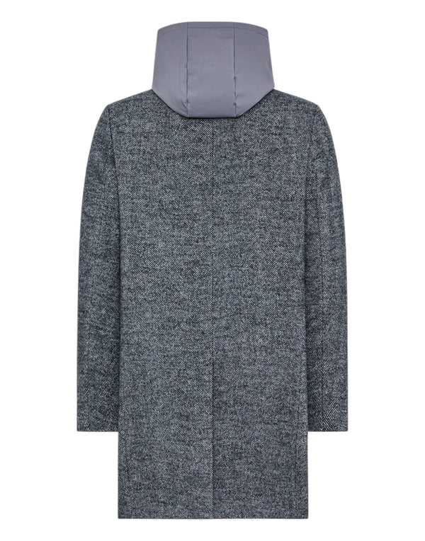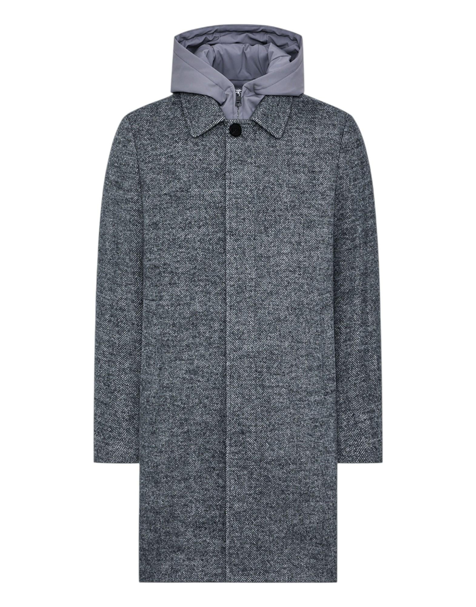 Soprabito dal taglio dritto e contemporaneo, realizzato in tessuto misto lana con fantasia spigata. Il cappuccio imbottito e removibile in nylon tecnico aggiunge un tocco funzionale e sportivo, rendendo questo capo ideale per un utilizzo quotidiano tra eleganza e praticità.