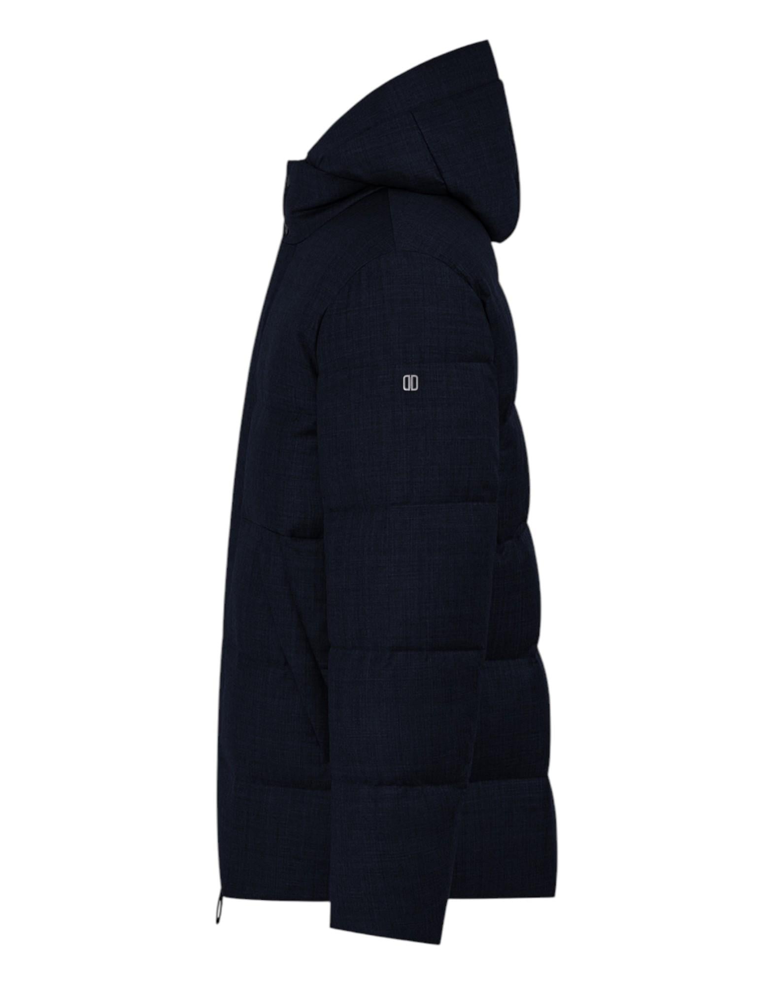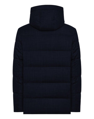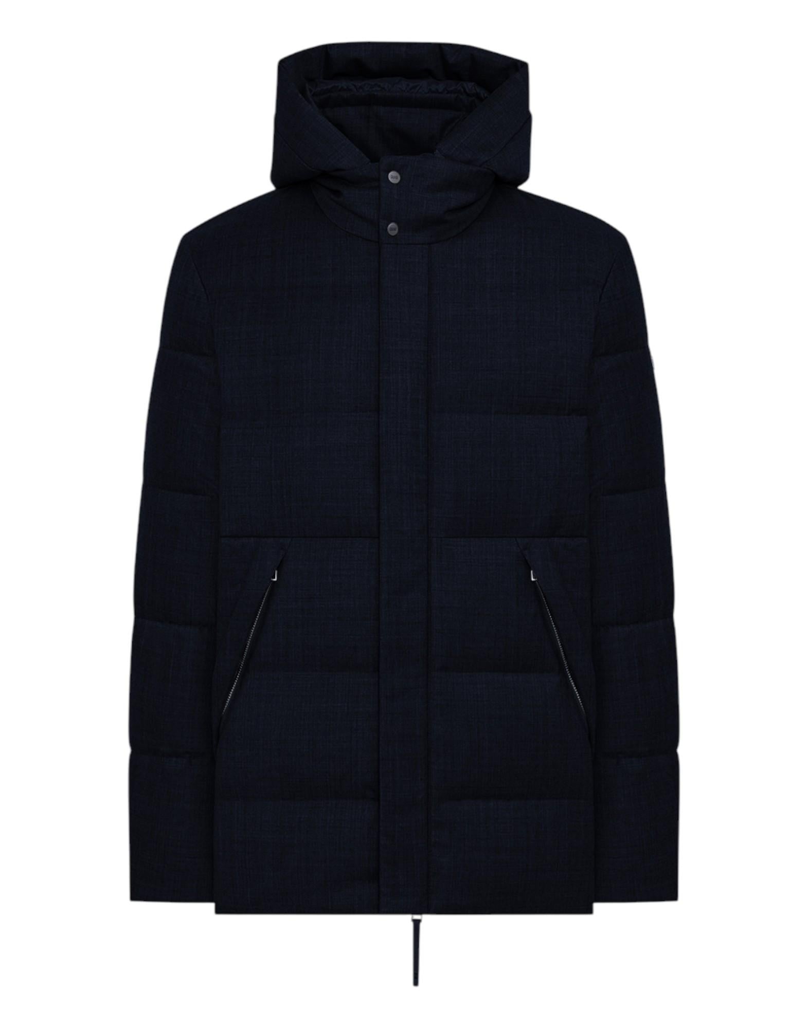 Giaccone imbottito dal taglio moderno e minimal, realizzato in pregiata lana per un look raffinato e caldo. La trapuntatura orizzontale, il cappuccio fisso e la chiusura con zip coperta da patta donano protezione e uno stile urbano adatto alla stagione fredda.