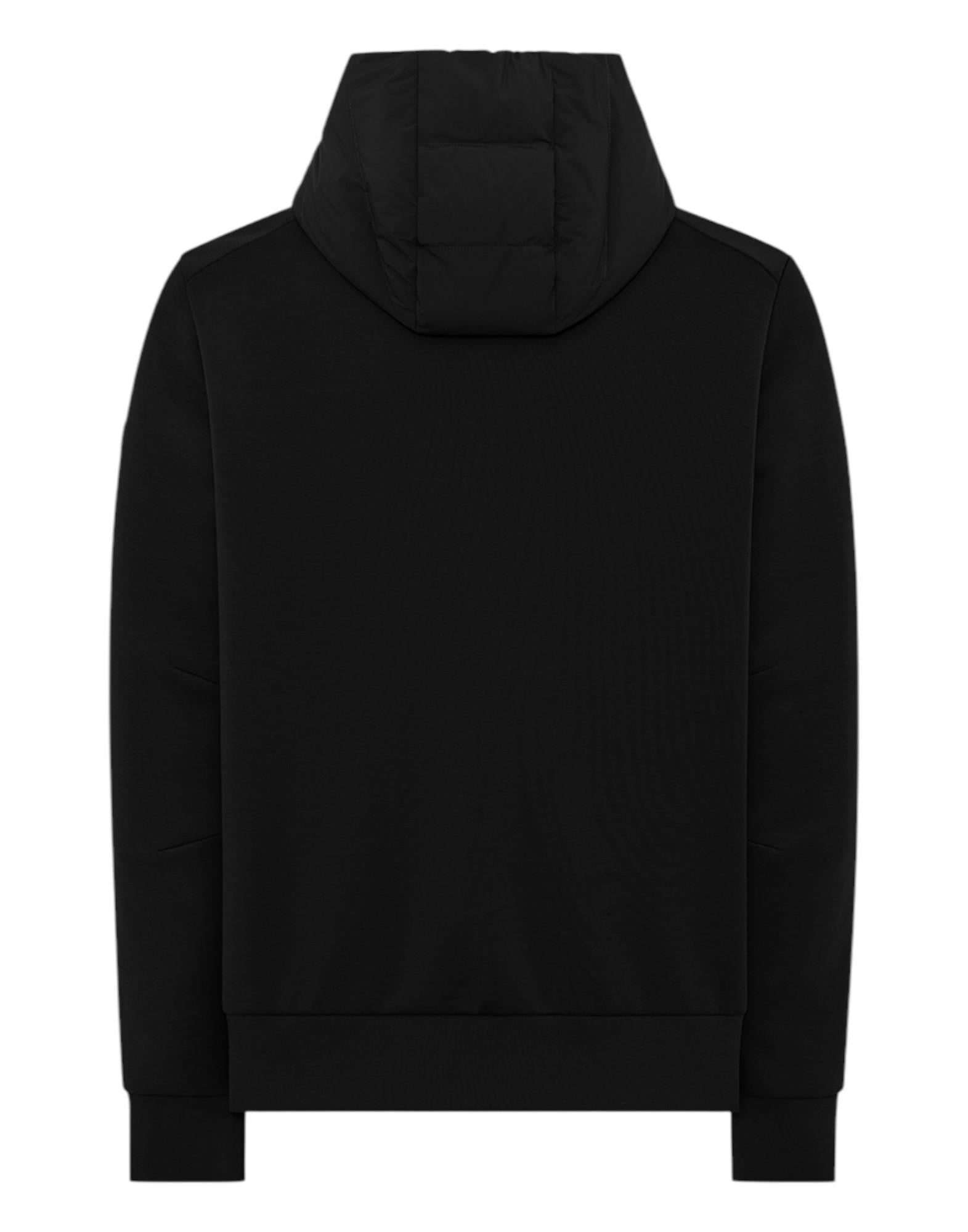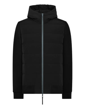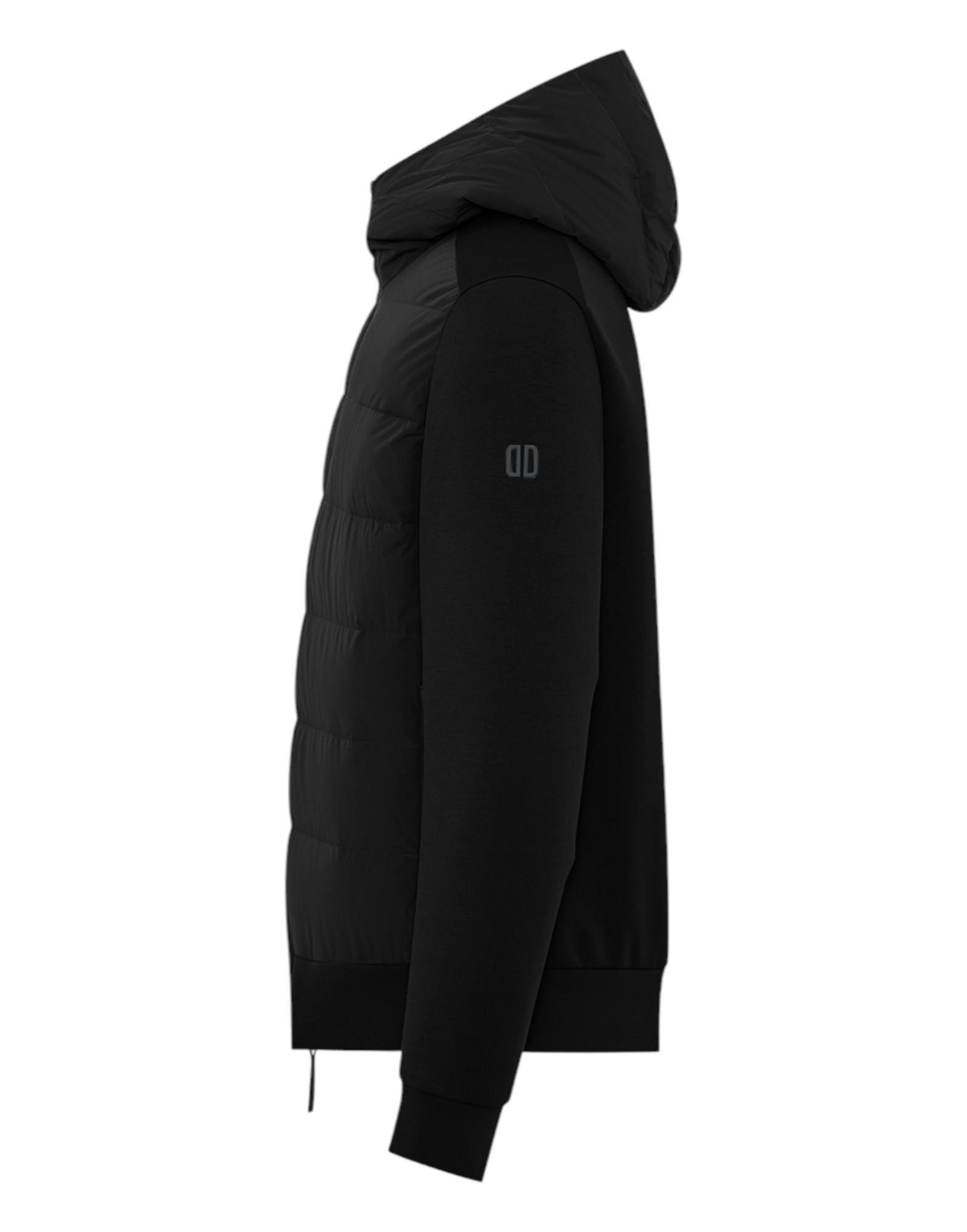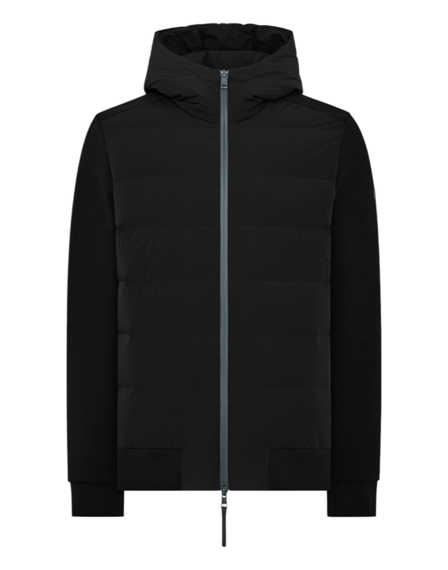 Giubbino imbottito dal design sportivo e contemporaneo, caratterizzato da pannelli frontali trapuntati e maniche in tessuto tecnico elasticizzato che garantiscono comfort e libertà di movimento. Il cappuccio fisso e la zip a doppio cursore completano un capo versatile e funzionale, ideale per la stagione fredda.