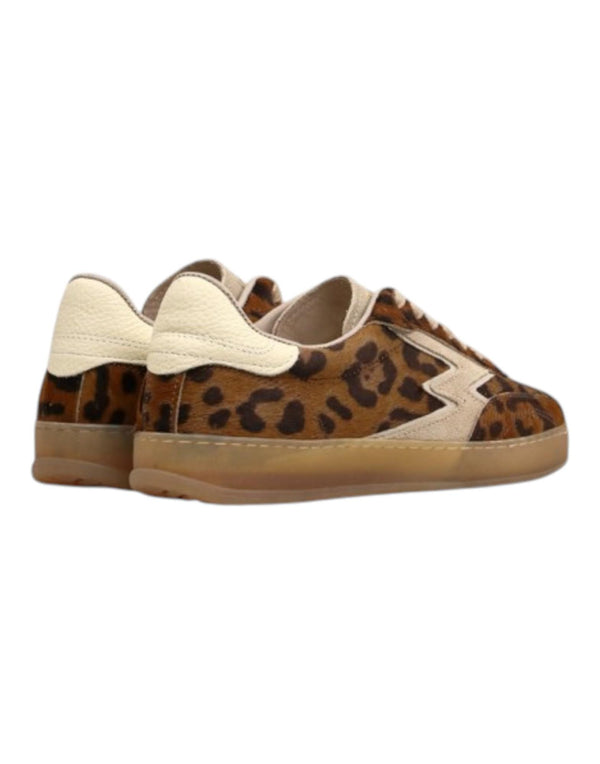 Sneaker unisex dal design deciso e contemporaneo, realizzata in pony hair con stampa leopardata per un effetto animalier unico. Il logo laterale in pelle off white e i dettagli in suede beige aggiungono equilibrio ed eleganza, mentre il backtab in pelle martellata off white completa il look. La suola in gomma miele garantisce stabilità e comfort, rendendo questo modello perfetto per outfit casual e ricercati.