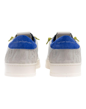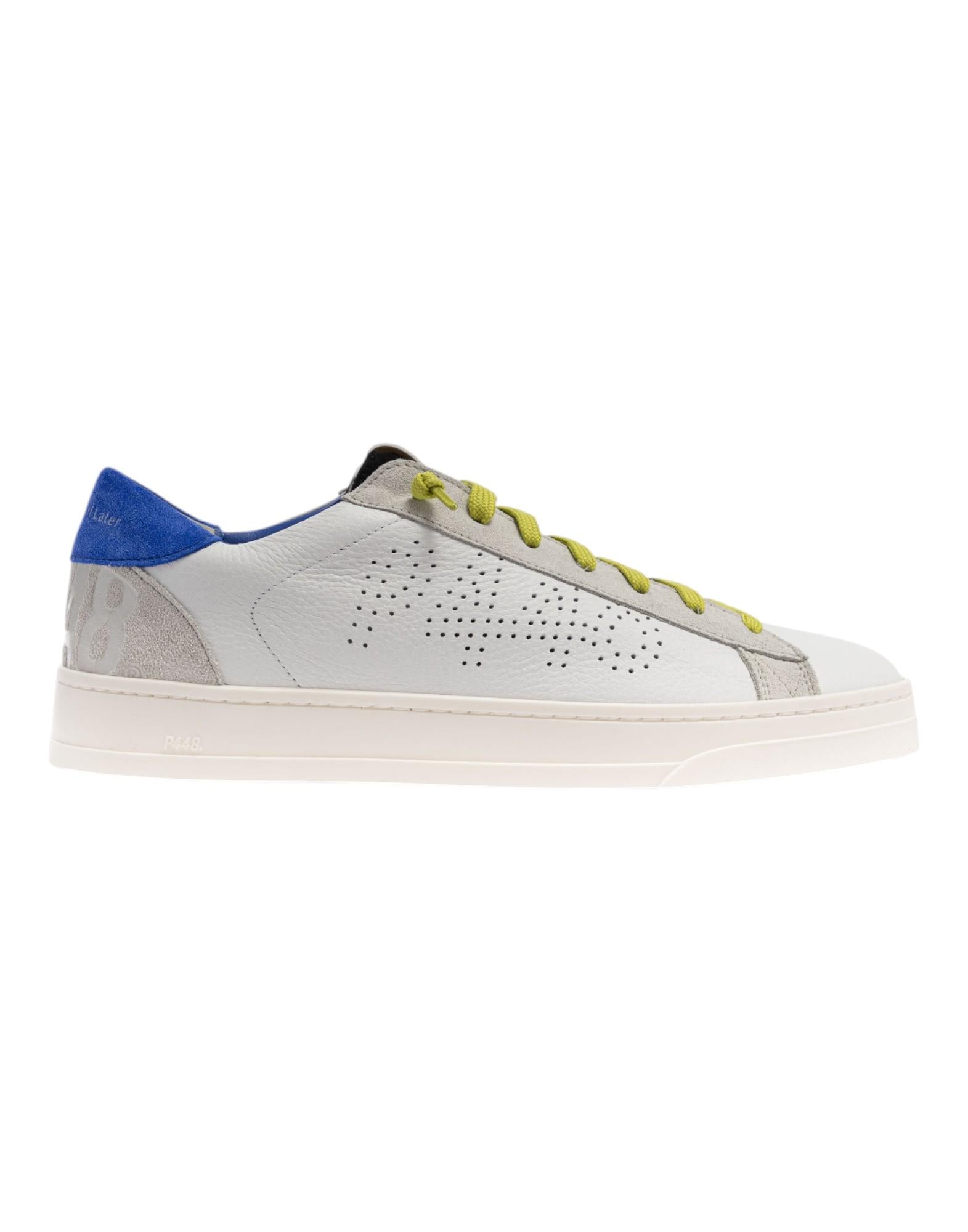 Sneaker artigianale Made in Italy, realizzata in pelle e suede di alta qualità. La tomaia in pelle bianca è caratterizzata dal logo P448 traforato e da dettagli in suede nero e off white che ne valorizzano il design contemporaneo. Il talloncino in pelle blu royal aggiunge un tocco di colore distintivo, mentre la fodera in spugna e la soletta in memory foam assicurano massimo comfort quotidiano.