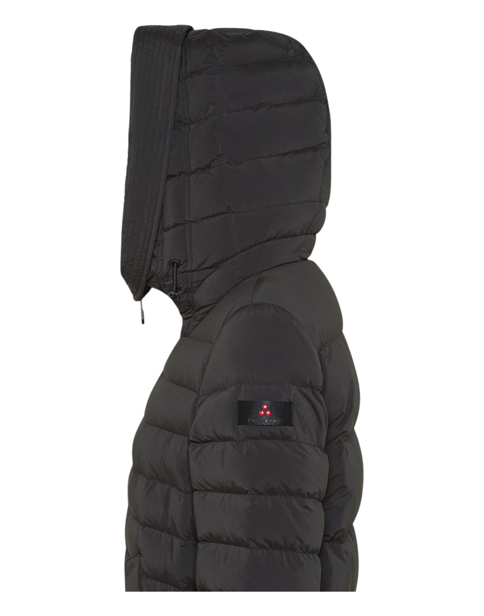 Piumino lungo trapuntato con imbottitura in piuma naturale, realizzato in nylon leggero e microfibra di poliestere sottoposti a trattamento termico a 130 °C per donare al tessuto una mano strutturata e un tatto polveroso. La finitura al silicone lo rende estremamente morbido e idrorepellente. Il modello presenta chiusura centrale con zip a doppio cursore, ampie tasche laterali e cappuccio fisso con collo rifinito in pelliccia di volpe tono su tono. Dal taglio regular, è un capo versatile e raffinato, ideale per affrontare l'inverno con eleganza.