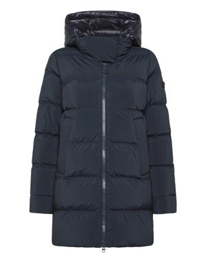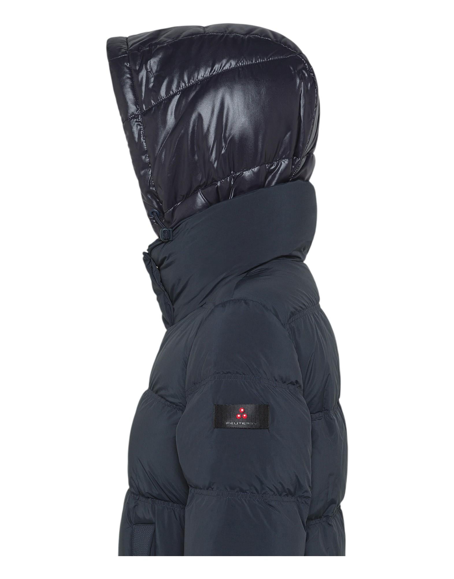 Piumino di media lunghezza realizzato in doppio tessuto: popeline leggero in nylon e microfibra di poliestere trattati a 130 °C per ottenere densità e un morbido effetto "pesca" al tatto. Il cappuccio fisso in nylon lucente, a contrasto materiale e con tiranti regolabili, aggiunge un dettaglio distintivo al design. Water repellent e wind resistant, questo capo presenta un trattamento PFC free e materiali riciclati certificati, con imbottitura in piuma riciclata, per un prodotto sostenibile e performante.