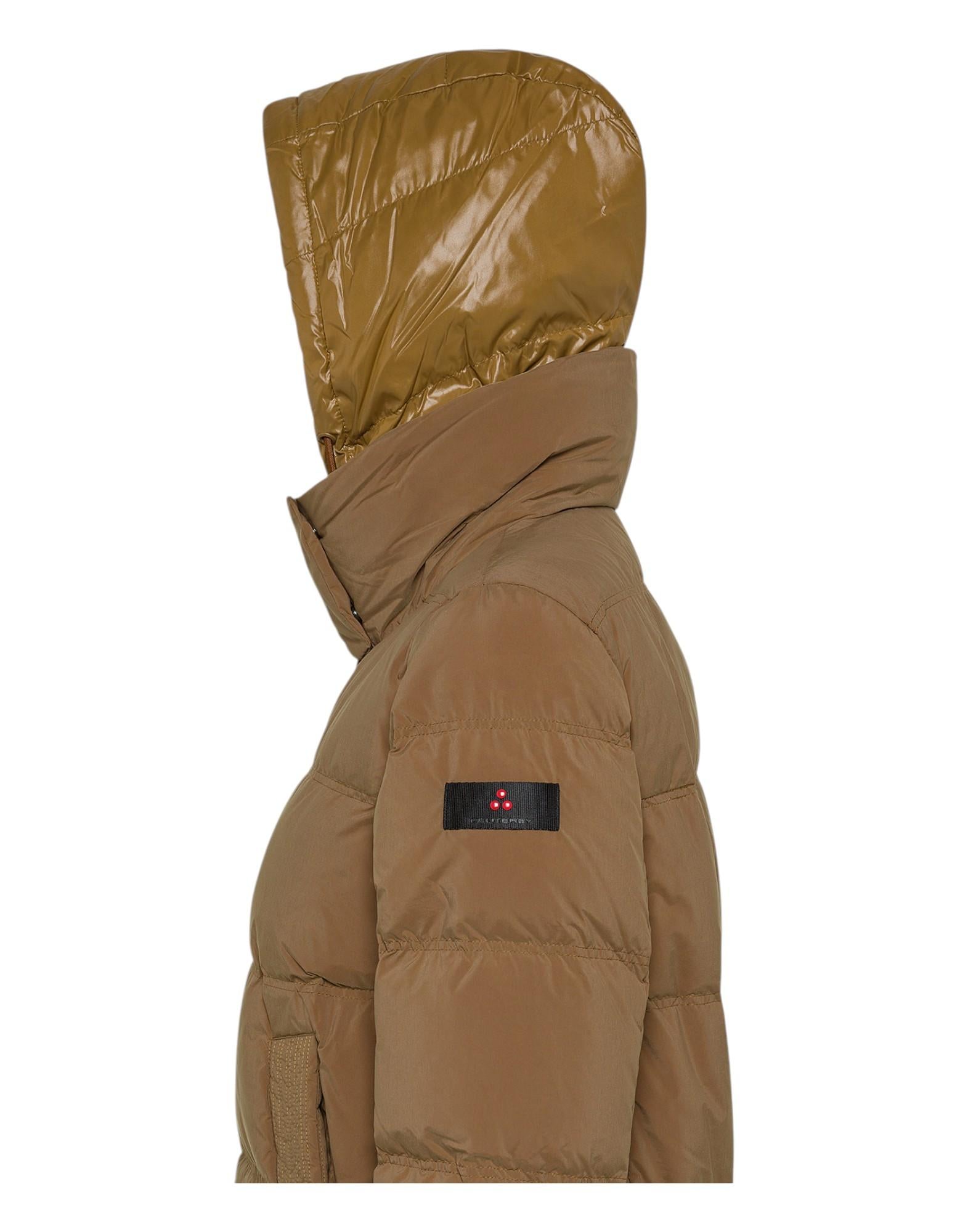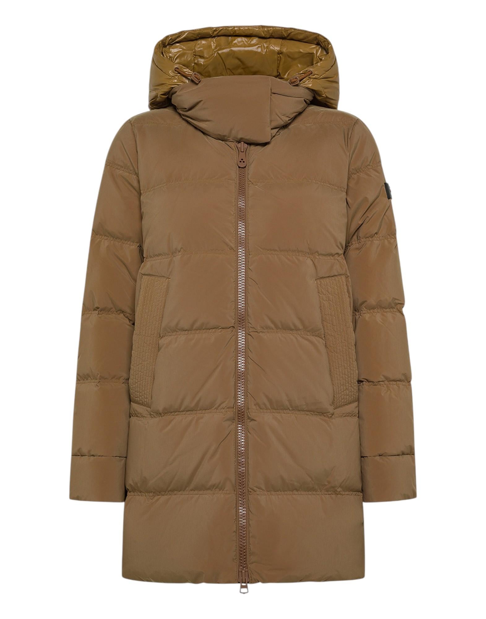 Piumino di media lunghezza realizzato in doppio tessuto: popeline leggero in nylon e microfibra di poliestere trattati a 130 °C per ottenere densità e un morbido effetto "pesca" al tatto. Il cappuccio fisso in nylon lucente, a contrasto materiale e con tiranti regolabili, aggiunge un dettaglio distintivo al design. Water repellent e wind resistant, questo capo presenta un trattamento PFC free e materiali riciclati certificati, con imbottitura in piuma riciclata, per un prodotto sostenibile e performante.
