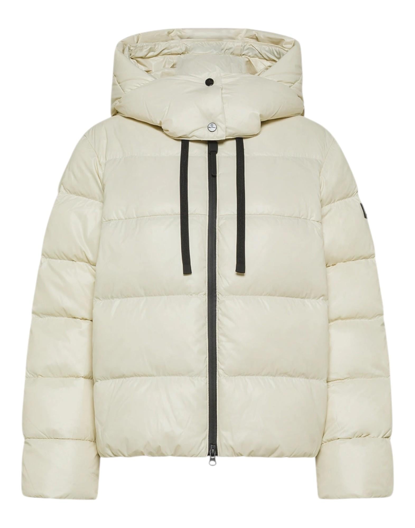 Piumino corto dal volume moderno, realizzato in nylon lucido effetto satinato trattato per una morbidezza setosa. L'imbottitura in piuma naturale certificata con fill power 650 garantisce calore e leggerezza. Dotato di doppio cappuccio--uno fisso interno e uno esterno removibile--per adattarsi alle diverse condizioni climatiche. Il collo alto con bottoni a pressione, la zip centrale a doppio cursore a vista in contrasto nero e le ampie tasche laterali completano un design urbano, pratico e distintivo. Il tessuto è inoltre trattato idrorepellente. La vestibilità è regular