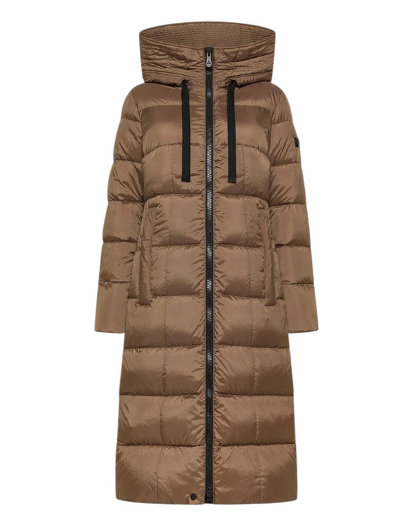 Un piumino lungo a trapunta orizzontale, realizzato in 100% poliestere riciclato post consumo con tessuto super-leggero, mano morbida, finitura semi-opaca e struttura ultra-compatta. L'imbottitura in piuma naturale certificata (Fill Power 650) assicura un calore elevato senza appesantire il capo.