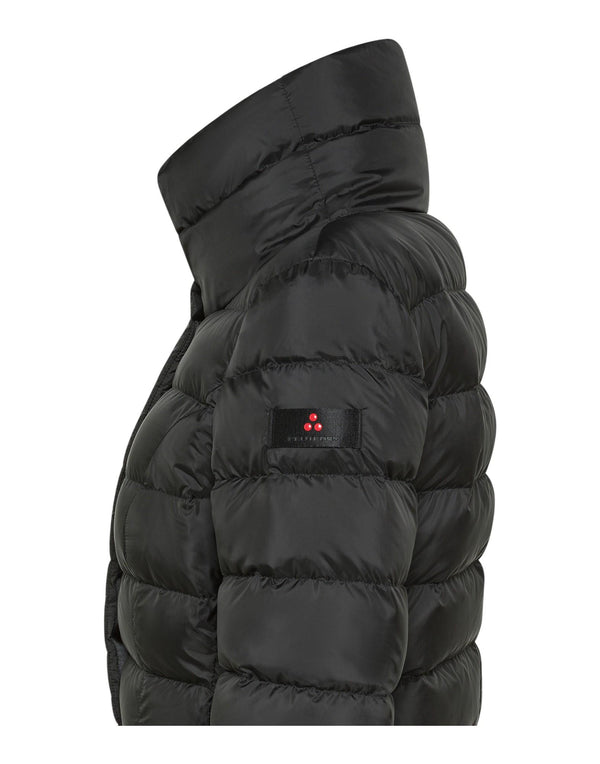 Il design essenziale è arricchito da dettagli funzionali e femminili: collo alto con bottoni a pressione tono su tono, chiusura centrale con zip a doppio cursore coperta da patta e tasche laterali discrete. La vestibilità slim valorizza naturalmente la silhouette, rendendo questo piumino un must-have per l'inverno in città e il tempo libero.