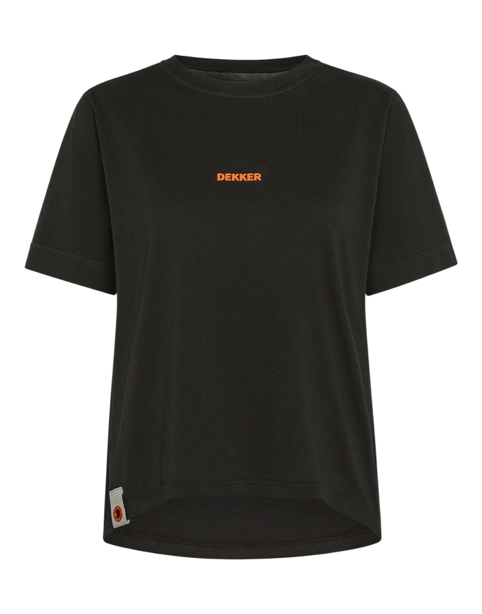 T-shirt dal design pulito e contemporaneo, realizzata in morbido jersey di cotone 100% per garantire comfort e traspirabilità. Il modello presenta una vestibilità regolare con fondo leggermente stondato, che ne esalta la linea essenziale. La scritta Dekker stampata sul davanti aggiunge un tocco grafico distintivo, mentre il cavallotto con personalizzazione sul fondo completa il capo con un dettaglio autentico. Una proposta versatile e moderna, ideale per un look casual e urbano di carattere.