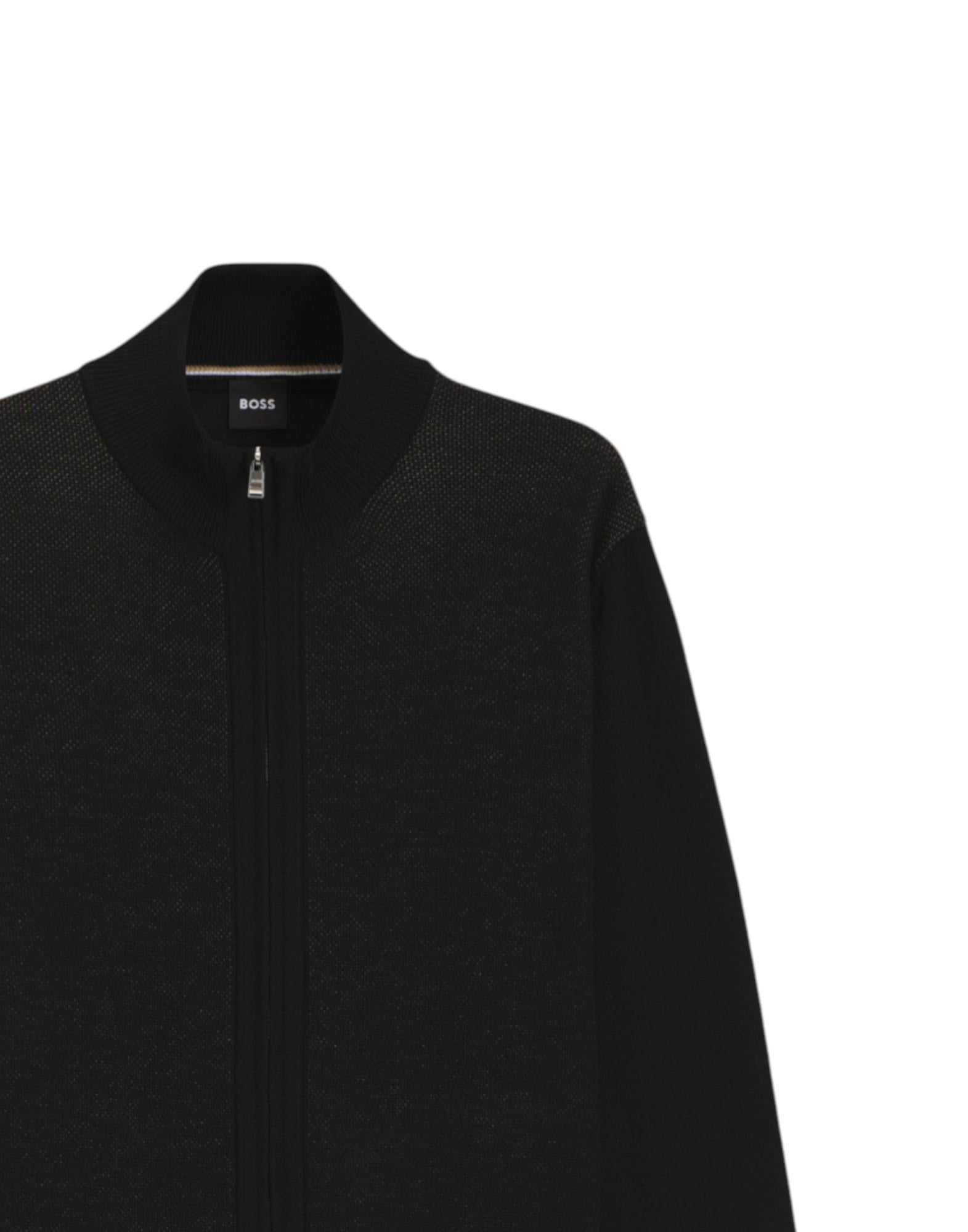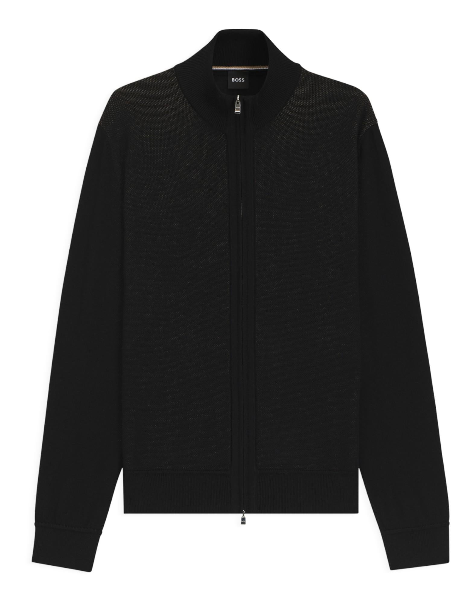 Cardigan elegante e versatile, caratterizzato da un pannello lavorato sul davanti in misto lana vergine e cotone, abbinato a una struttura in morbida lana vergine di alta qualità. La vestibilità regular fit e il collo con zip lo rendono un capo pratico e moderno, ideale per completare look casual o raffinati. Realizzato con lana proveniente da allevamenti responsabili e mulesing-free, assicura comfort e sostenibilità.
