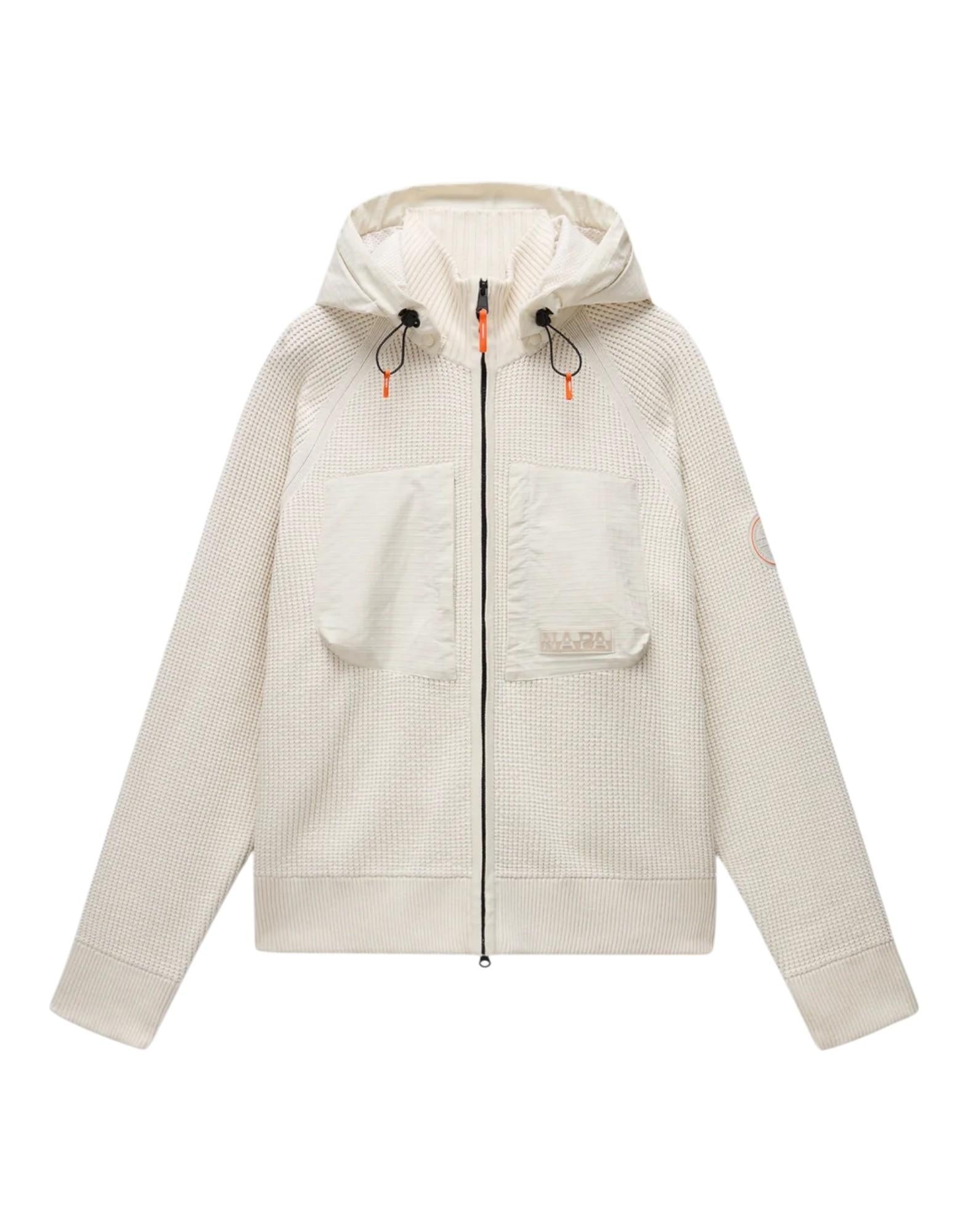 Giacca in maglia dal design ibrido e funzionale, pensata per unire comfort, calore e stile contemporaneo. Realizzata in un mix di cotone e poliammide, combina la morbidezza della maglia con inserti tecnici a contrasto che aggiungono resistenza e un tocco urbano. Il modello presenta una chiusura frontale con zip bidirezionale e un cappuccio staccabile con occhielli in plastica per la massima versatilità. Le due tasche sul petto con chiusura a zip, di cui una impreziosita dall'iconico logo patch Napapijri, ne sottolineano l'identità distintiva. Rifinita con stemmi e dettagli puliti, è una giacca perfetta per la mezza stagione e per un uso quotidiano dinamico.