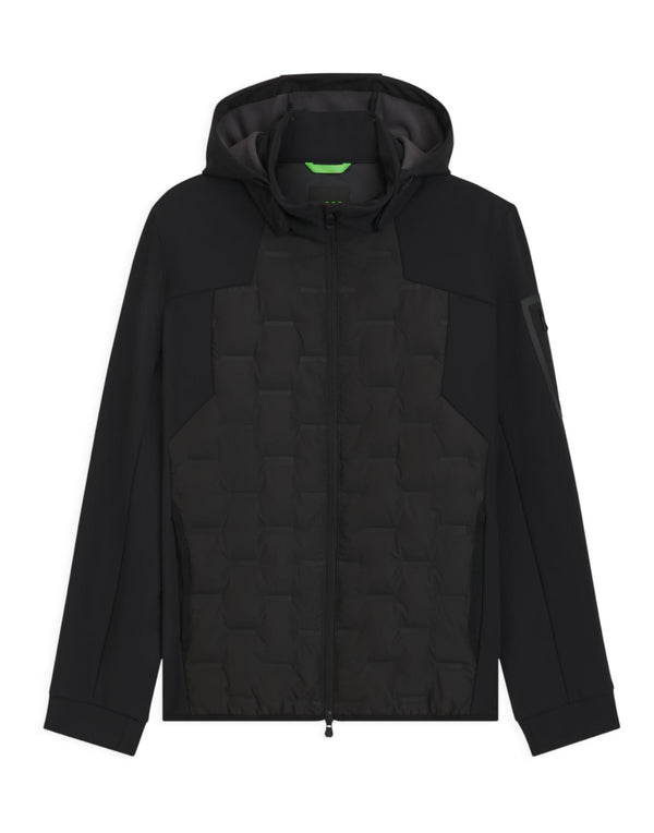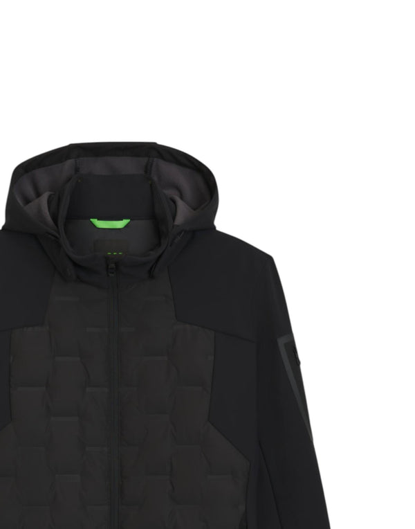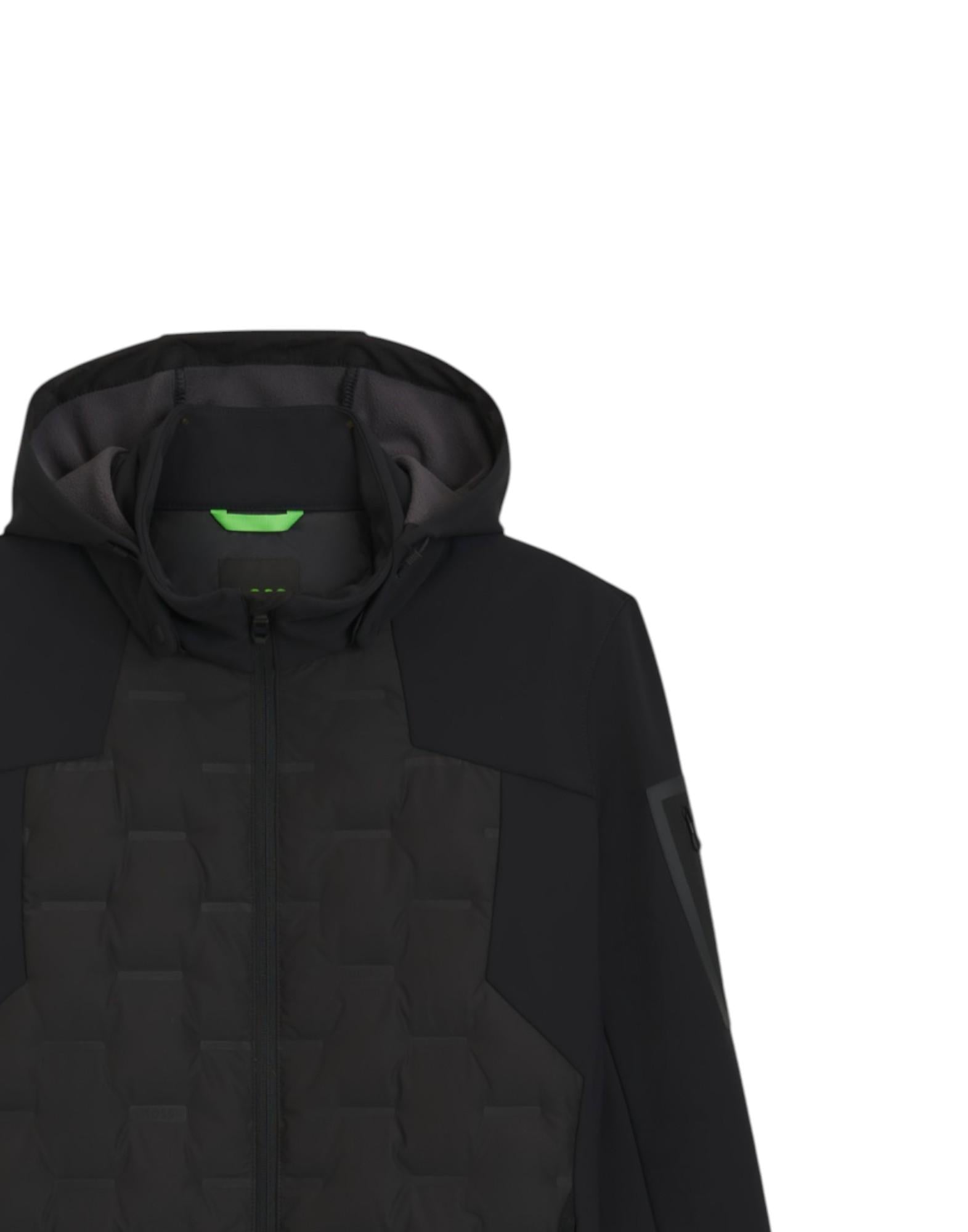 Giubbotto idrorepellente perfetto per la mezza stagione, realizzato in tessuto tecnico con imbottitura in piumino e piume d'anatra certificati che garantiscono calore e leggerezza. Il cappuccio rimovibile permette di adattare il capo alle diverse condizioni climatiche, mentre la vestibilità regular fit assicura comfort quotidiano. Il motivo con logo saldato aggiunge un dettaglio distintivo e moderno.