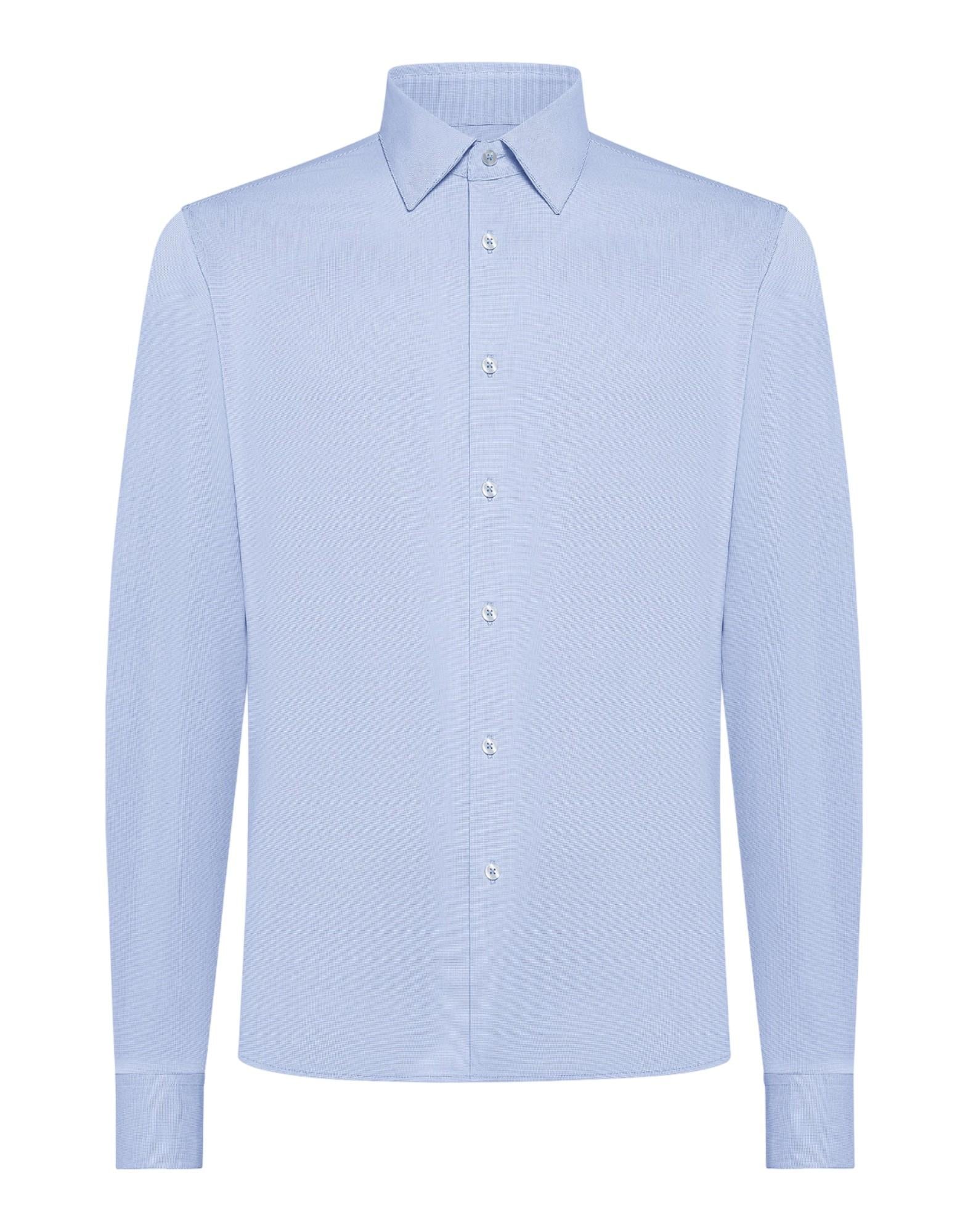 Camicia slim fit dallo stile essenziale e sofisticato, realizzata in finissimo tessuto Oxford elasticizzato lavorato a jacquard in una selezione di micro motivi geometrici nei toni del blu e dell'azzurro. Il colletto classico regolare e l'abbottonatura alla francese con bottoni in madreperla definiscono una silhouette pulita e raffinata, perfetta per un'eleganza disinvolta e moderna.