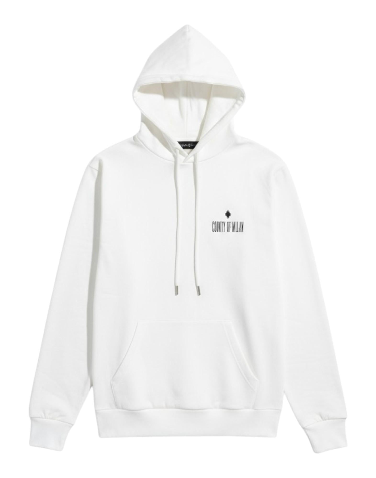 Felpa uomo in cotone 100% firmata Marcelo Burlon County of Milan. Il modello presenta un design essenziale e contemporaneo, con cappuccio regolabile e ampia tasca frontale a marsupio. Sul petto si distingue il logo "County of Milan" con la croce iconica del brand, mentre sul retro è protagonista la maxi stampa geometrica a contrasto che richiama l'estetica street e grafica tipica della maison. Realizzata in morbido cotone per garantire comfort e stile in ogni occasione.