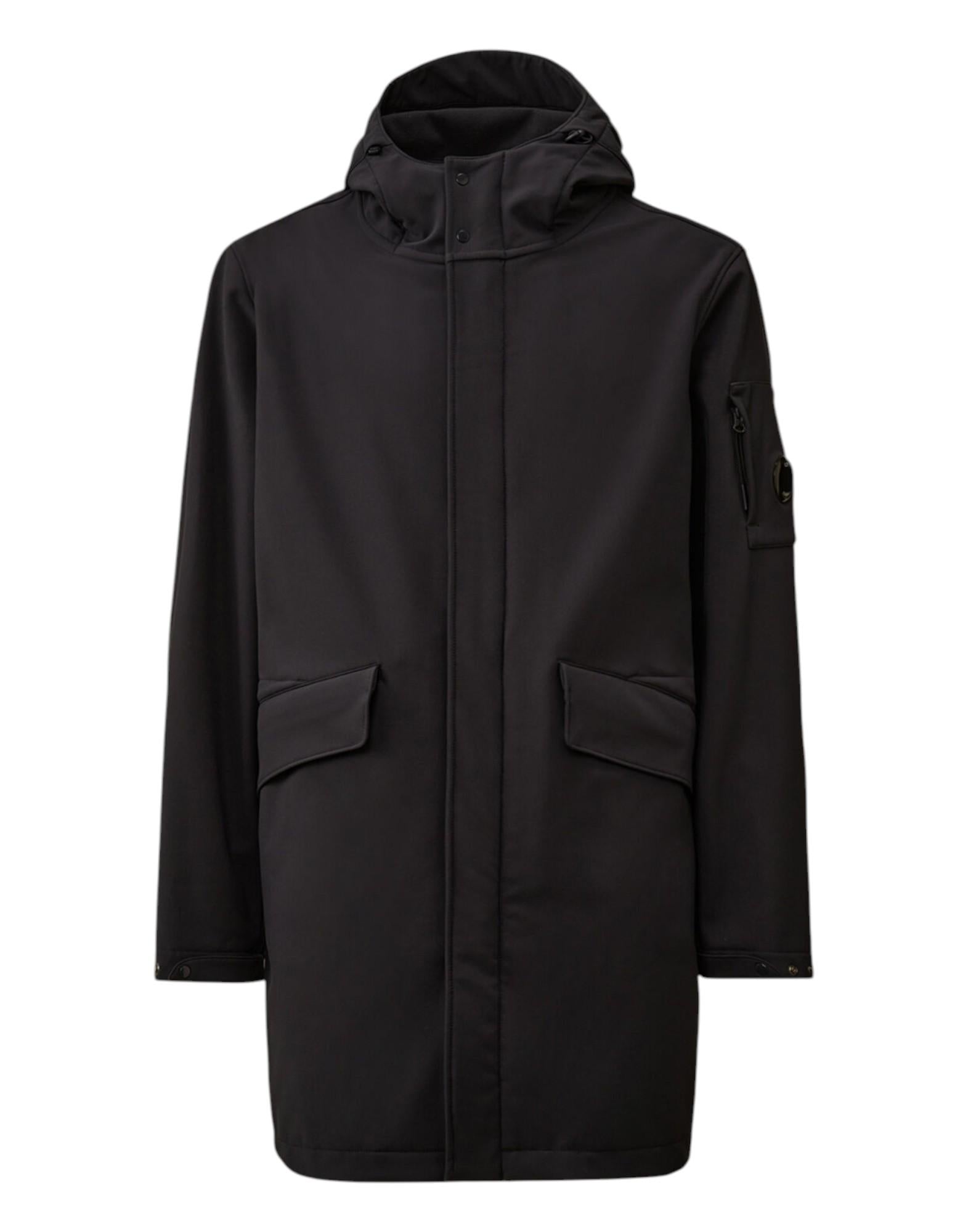 Parka tecnico con cappuccio realizzato in C.P. Shell-R, un soft-shell stretch a tre strati in poliestere riciclato certificato GRS. Resistente al vento e all'acqua (colonna d'acqua 5000 mm), garantisce comfort e protezione con uno stile urbano e contemporaneo. È dotato di cappuccio regolabile, chiusura frontale con zip a doppio cursore coperta da patta a pressione, tasche frontali con pattina e l'iconica tasca Lens sulla manica. I polsi regolabili completano un design funzionale e versatile, perfetto per affrontare le stagioni intermedie e l'inverno con praticità ed eleganza.