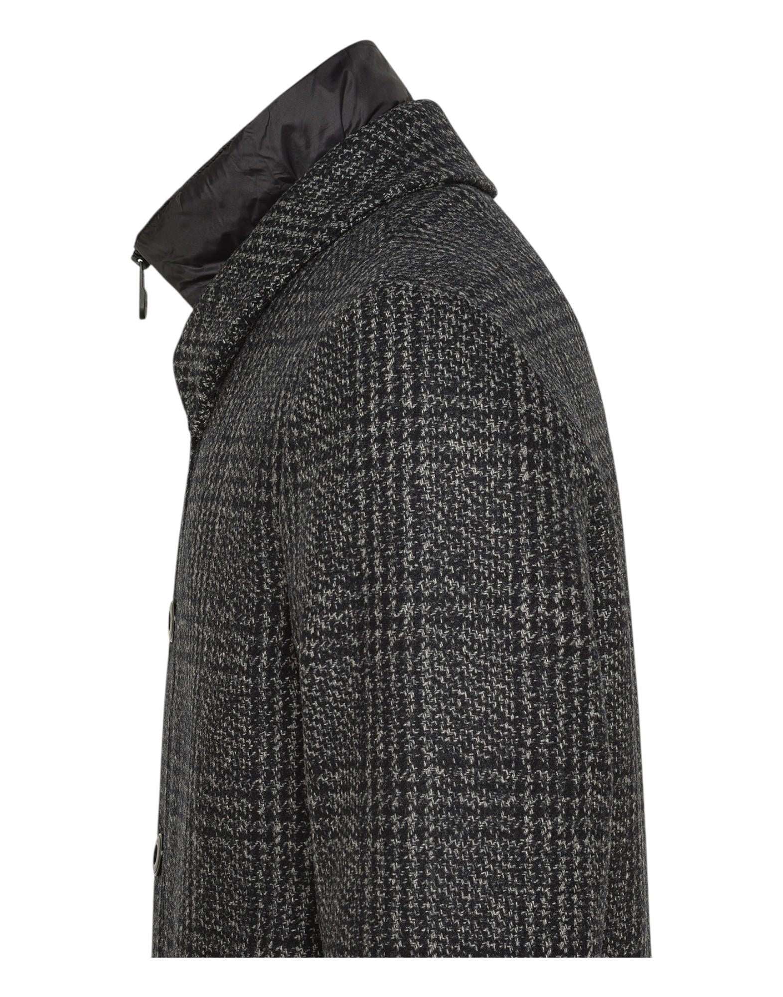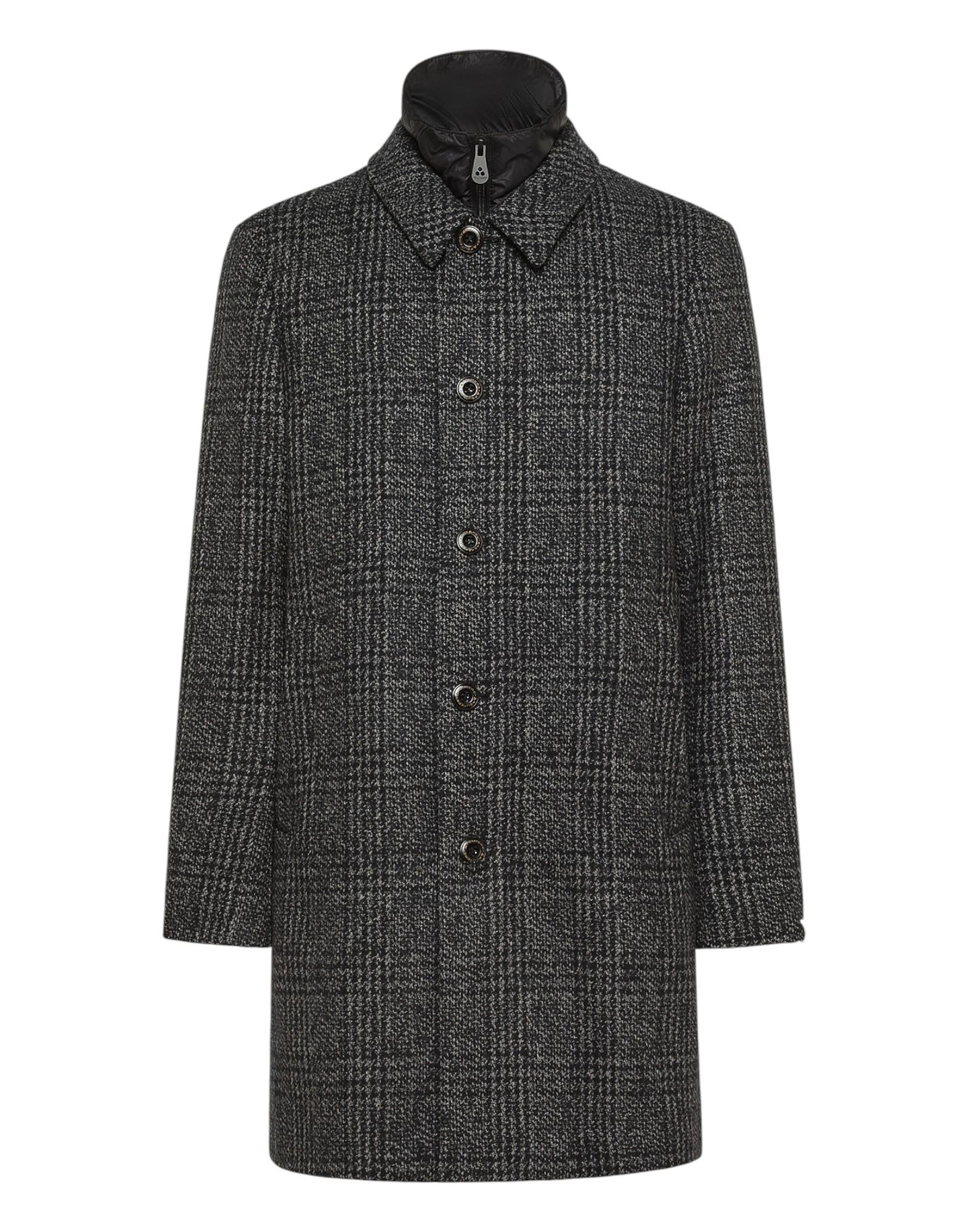 Cappotto elegante realizzato in panno misto lana e acrilico, caratterizzato da un motivo check che dona un tocco classico e sofisticato. Il modello presenta collo a camicia e pettorina interna removibile che aggiunge praticità e protezione dal freddo. La chiusura frontale con bottoni completa il design essenziale e versatile, perfetto per un guardaroba urbano contemporaneo. La vestibilità regolare lo rende adatto a molteplici abbinamenti.