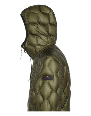 Moderno piumino dallo stile sportswear, caratterizzato da una trapunta con motivo geometrico che dona al capo un look dinamico e contemporaneo. Realizzato principalmente in nylon ripstop 7 den, un tessuto sottilissimo ma altamente resistente agli strappi con finitura lucida, è combinato con nylon stretch multi bava accoppiato a jersey soffice per garantire comfort termico e morbidezza.
