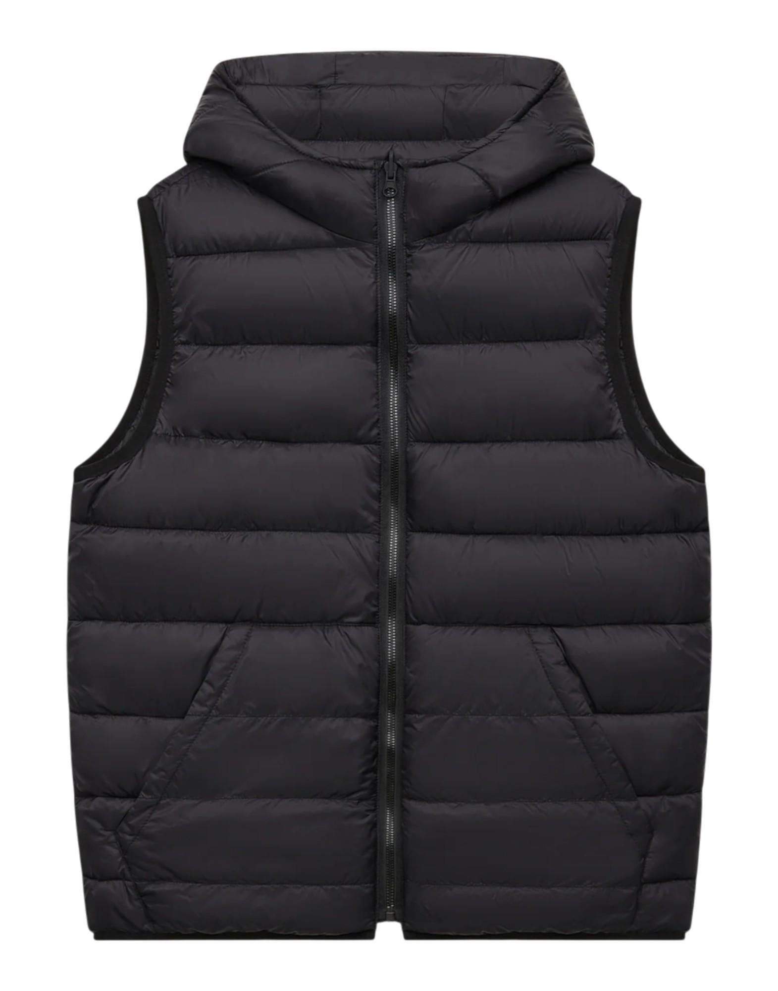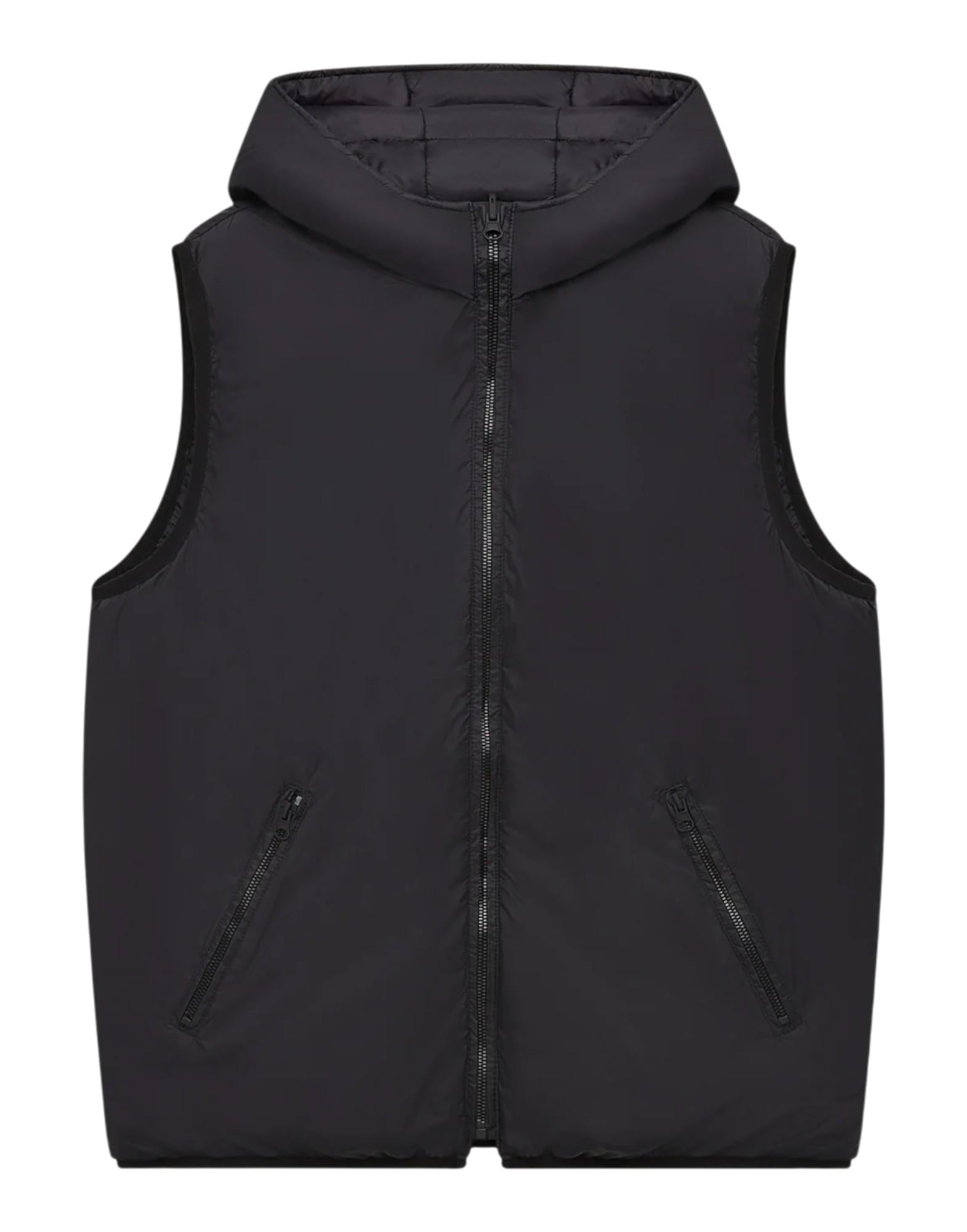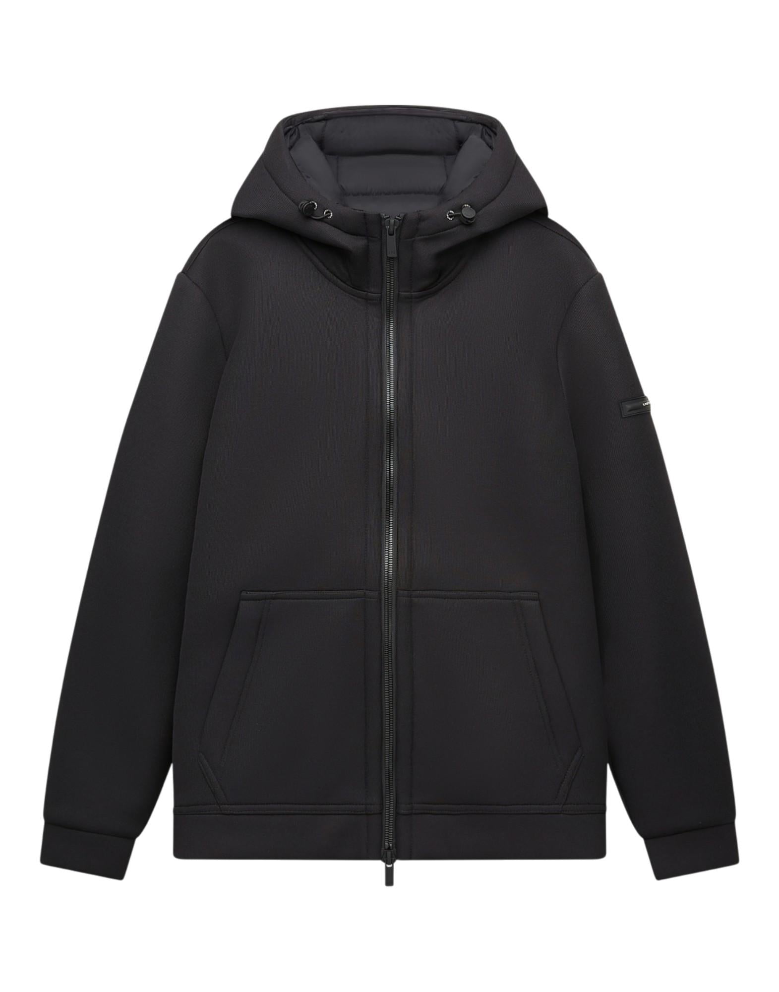 Il capo esterno è realizzato in maglia ingegnerizzata con effetto tecnico e include un interno completamente removibile: un piumino leggero reversibile, indossabile separatamente per una doppia vestibilità.