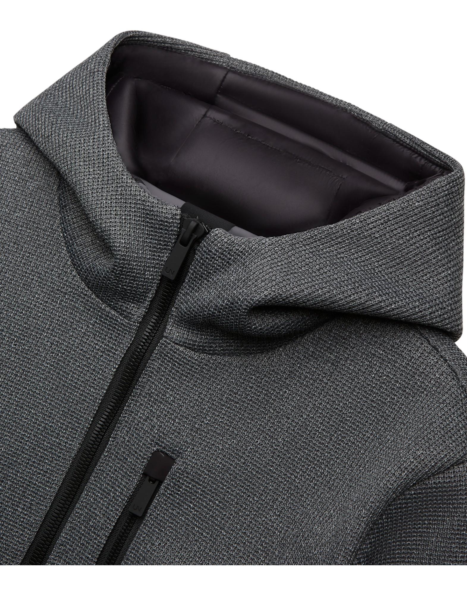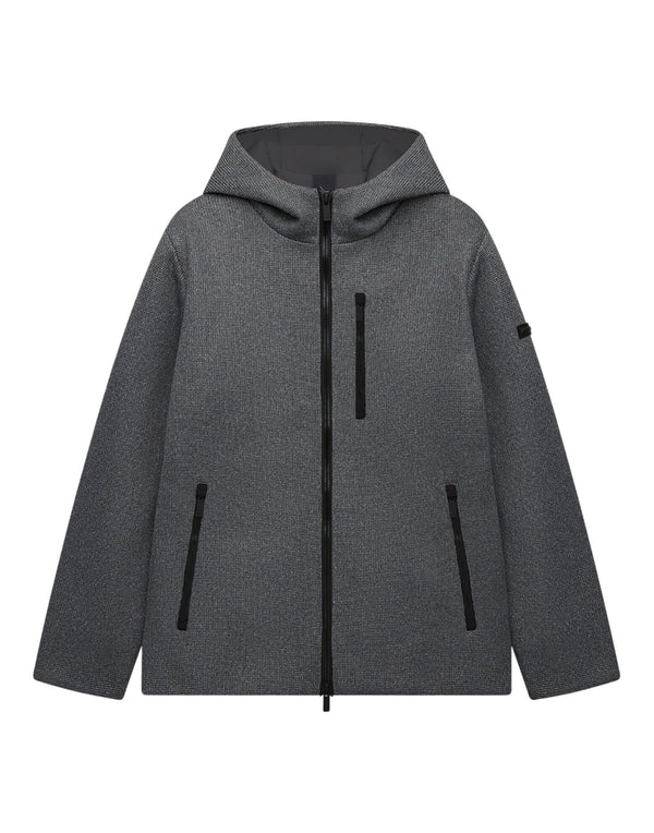 Giubbotto con cappuccio firmato Unity, caratterizzato da un design contemporaneo e dalla particolare texture melange del tessuto tecnico a maglia. Realizzato in poliestere riciclato, unisce resistenza e leggerezza, mentre l'imbottitura garantisce calore e comfort. La chiusura frontale con zip impermeabile a doppio cursore, le tasche laterali e la tasca verticale sul petto lo rendono funzionale e versatile. Un outerwear urbano e sofisticato, perfetto per affrontare la stagione con stile e praticità.