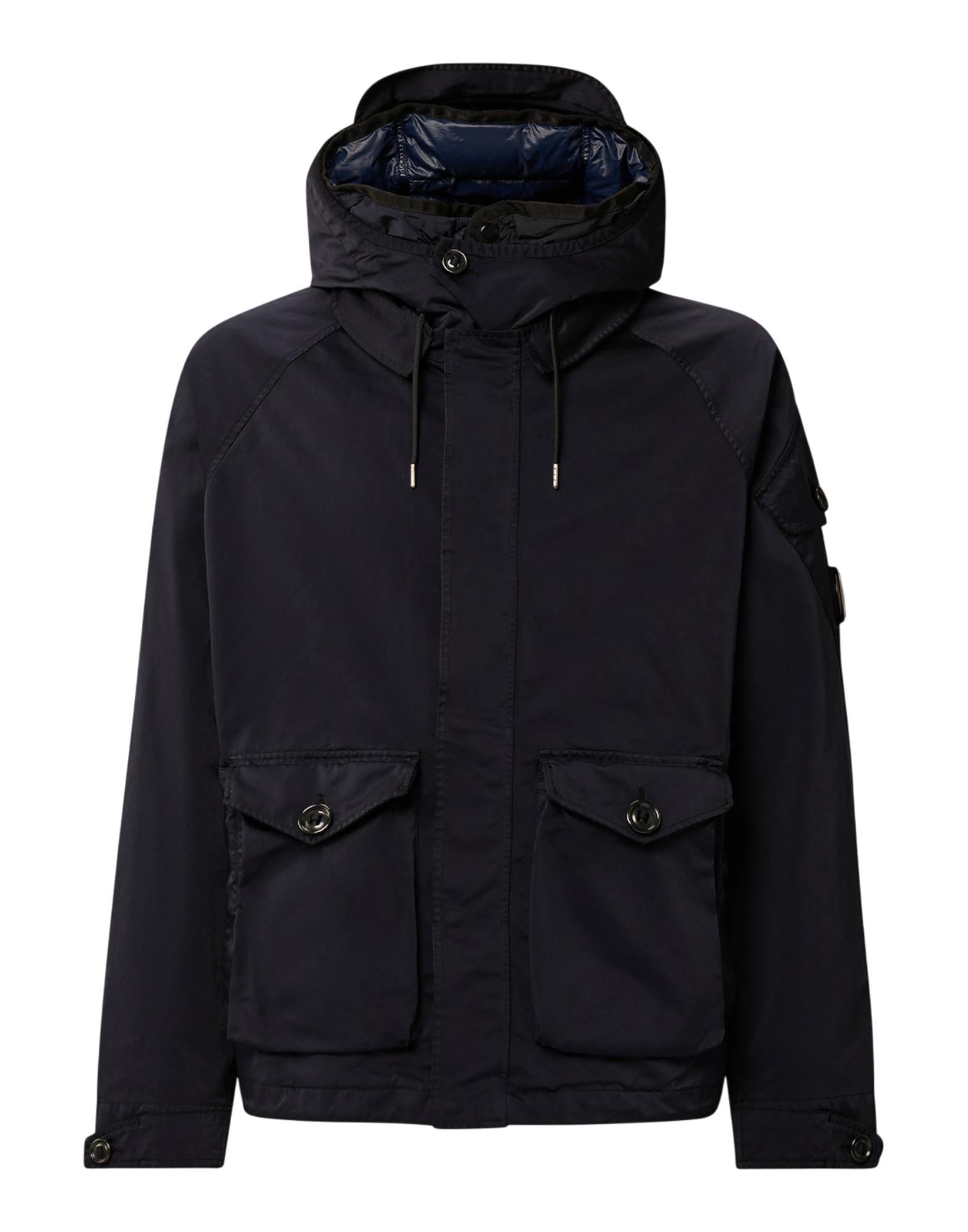 Il capo presenta cappuccio con visiera regolabile e protezione per il viso con bottoni, chiusura full zip nascosta da patta con bottoni automatici, tasche frontali applicate con doppia apertura e tasca sulla manica con bottone e Lente C.P. Company.