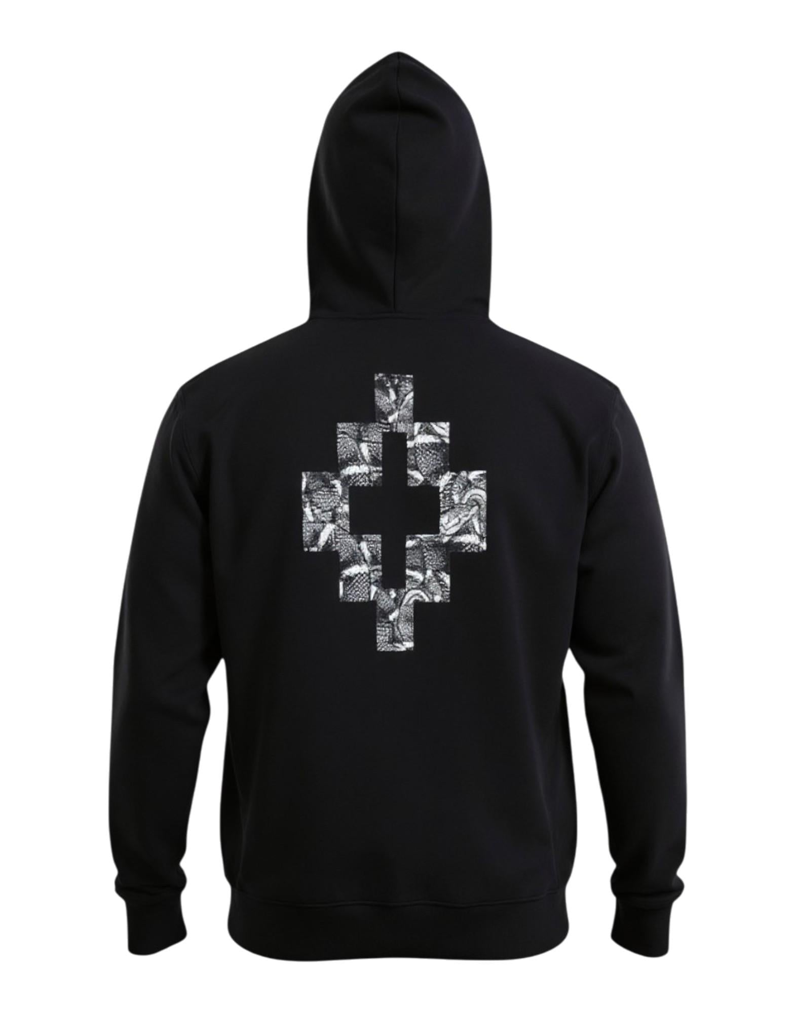 Felpa uomo in cotone 100% firmata Marcelo Burlon County of Milan. Il modello presenta un design contemporaneo con cappuccio regolabile e tasca a marsupio, unendo comfort e stile urbano. Sul petto spicca il logo "County of Milan" ricamato con la croce iconica del brand, mentre sul retro è protagonista la maxi stampa geometrica a contrasto che richiama l'estetica distintiva della maison. Una felpa versatile e moderna, perfetta per completare look casual di tendenza.