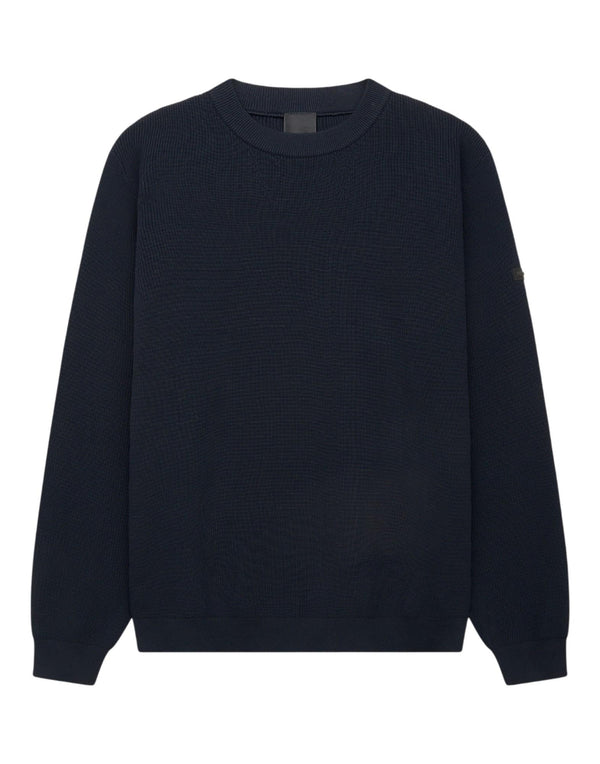Maglia girocollo firmata Unity, dal design essenziale e moderno. Realizzata in tessuto tecnico a maglia fine con esterno in poliestere riciclato, offre leggerezza, comfort e traspirabilità, ideale per l'uso quotidiano e per look casual raffinati. Il taglio regolare e i polsini e fondo a coste elasticizzate completano la silhouette pulita e versatile del capo.