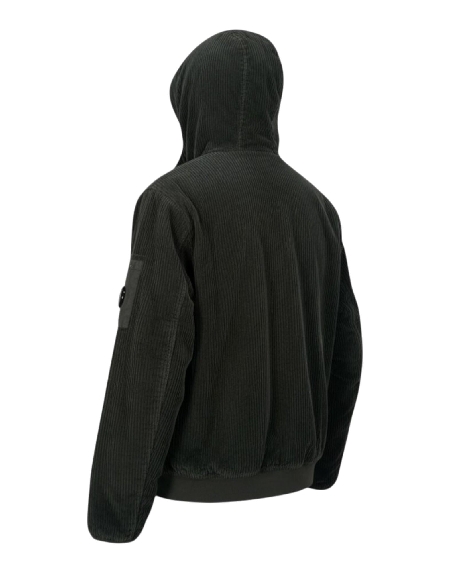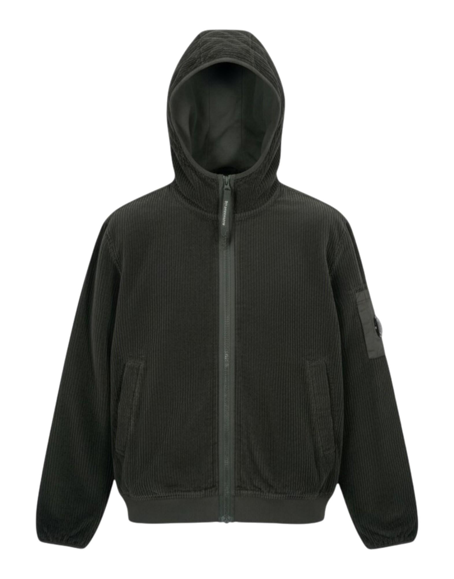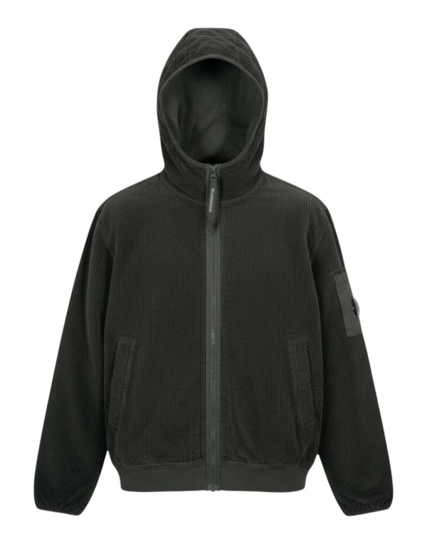 Felpa full zip firmata C.P. Company, realizzata in velluto stretch 350 righe che unisce morbidezza, comfort e un aspetto sofisticato. Il design presenta cappuccio regolabile, tasche laterali e l'iconico taschino con Lente C.P. Company sulla manica.