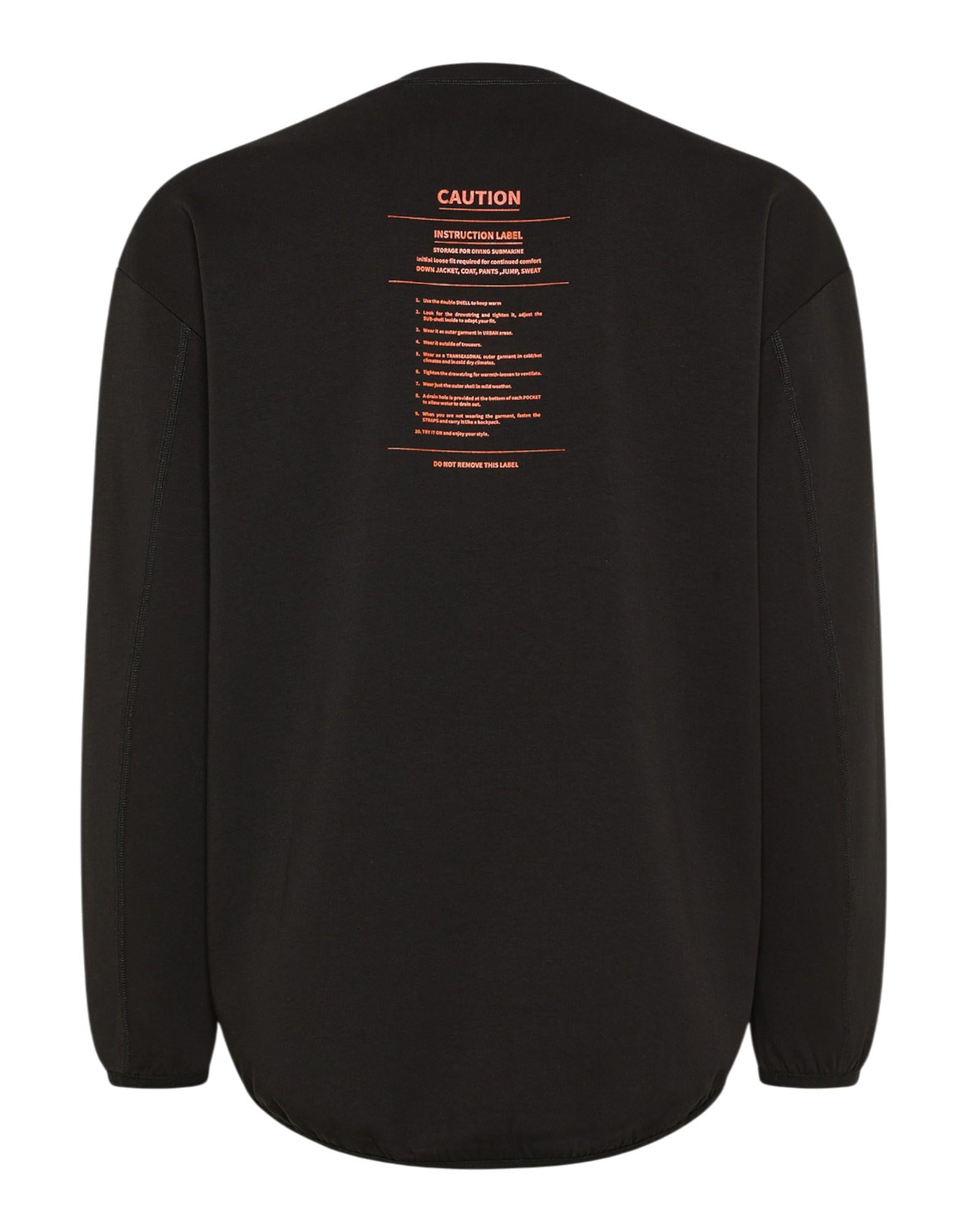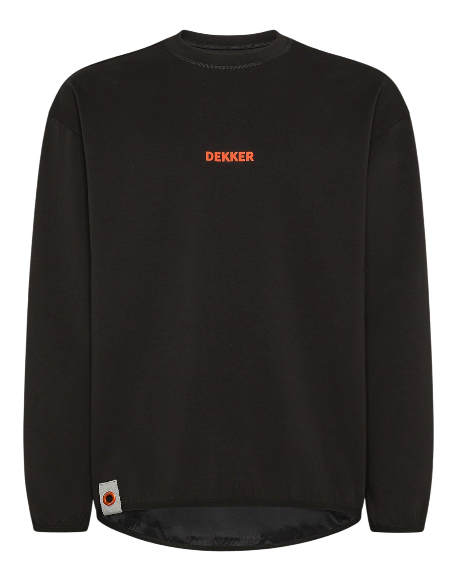 Felpa oversize dal design contemporaneo e deciso, realizzata in tessuto scuba misto cotone, poliammide ed elastan, per una mano morbida, compatta ed estremamente confortevole. La costruzione asimmetrica -- più corta sul davanti e più lunga sul retro -- dona al capo un carattere dinamico e moderno. La stampa logo centrale a contrasto e la stampa "CAUTION" sul retro esprimono un'estetica grafica audace. Dettagli iconici come il cavallotto con oblò metallico a fondo capo e il nastro arancione logato applicato sul retro completano la felpa con la firma inconfondibile Dekker. Pratica e versatile, è perfetta da indossare da sola o in layering per aggiungere un tocco distintivo ai look urbani.